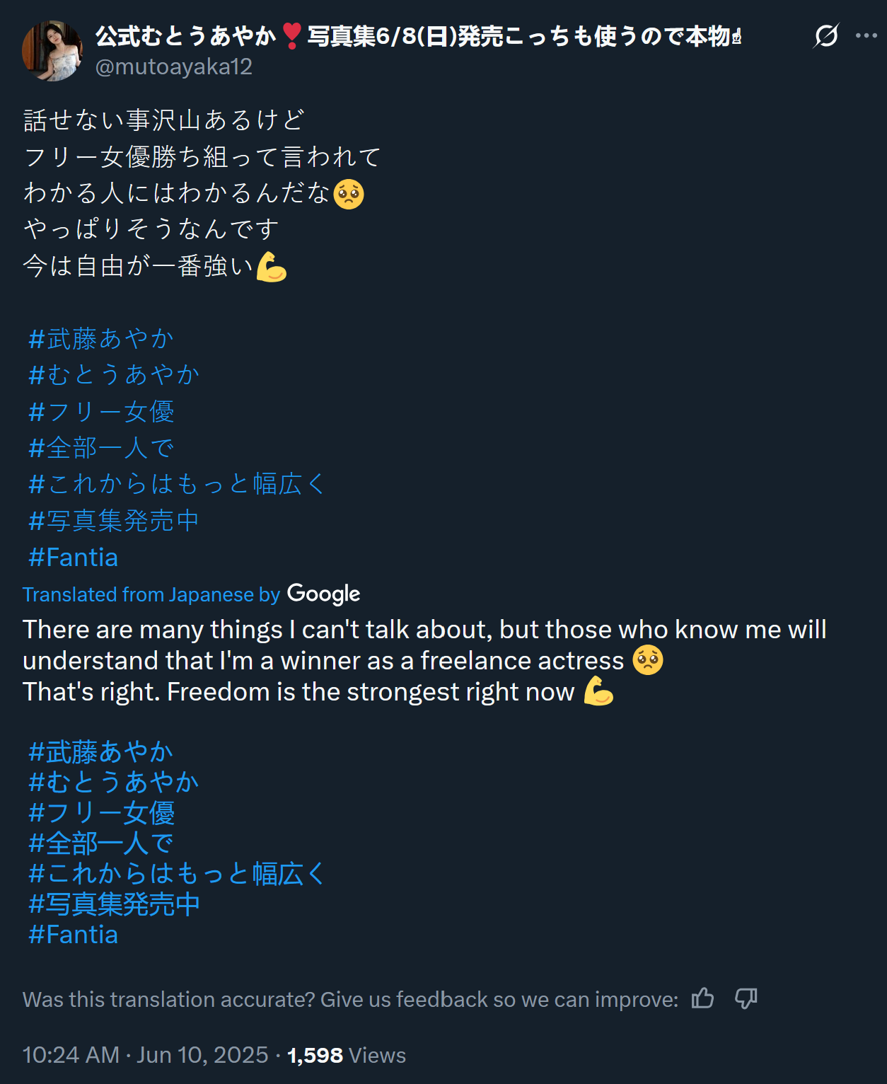 Ayaka Mutou left her agency and is looking to independently represent herself, but who knows how that shakes out? We saw the same case for Sora Amakawa and she ultimately left mainstream porn. And who knows what is happening with Karen Kaede? She posted a message online saying she wanted to leave porn before shortly deleting the message and this was around the time she was on hiatus from shooting.