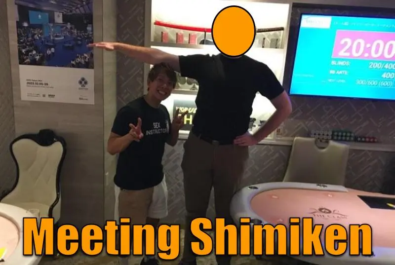 The venue in question was a gambling parlor. We were using it before its usual business hours, thus having the entire space to ourselves, but said space was still very small. There were only four dealer tables in the whole room, with us centered around one, and you could see the entire bar and kitchen behind the counter, it was so tiny. Despite this size though, it seemed to be a well-regarded establishment, if the trophies and posters for poker tournaments proudly displayed throughout the place were any indication. Also, it’s not like Shimiken would have chosen an obscure hole in the wall to give a talk. He didn’t even have security present, an absence I found all the more notable given how famous he is. Other features of the place were the carpet flooring and the really amazing chairs. Like, they were basically the fancy leather chairs you’d find round a rich person’s dinner table, but they had wheels, like office chairs, so in terms of style, comfort, and mobility they simply couldn’t be beat. Also, there were massive tv displays to serve as scoreboards stationed throughout the room. No clocks anywhere though. We had to keep checking our phones and watches.