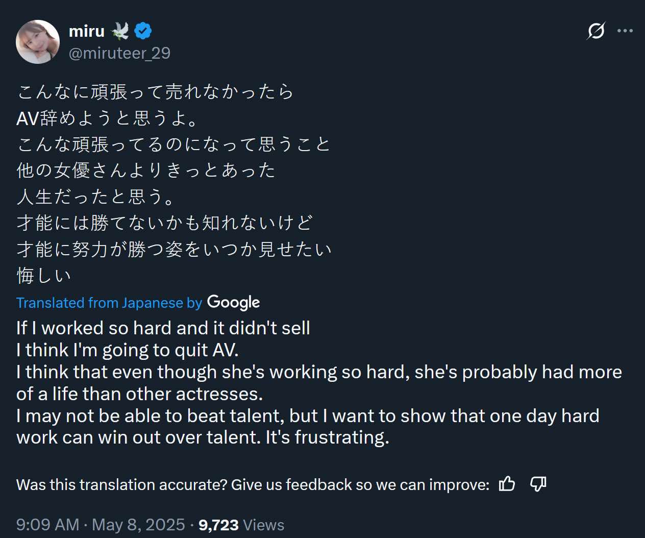 "If I work so hard and it didn't sell, I think I'm going to quit AV. I think I've been working so hard, more than any other actress. I may not be able to beat talent, but I want to show everyone one day that hard work can win out over talent. It's frustrating."