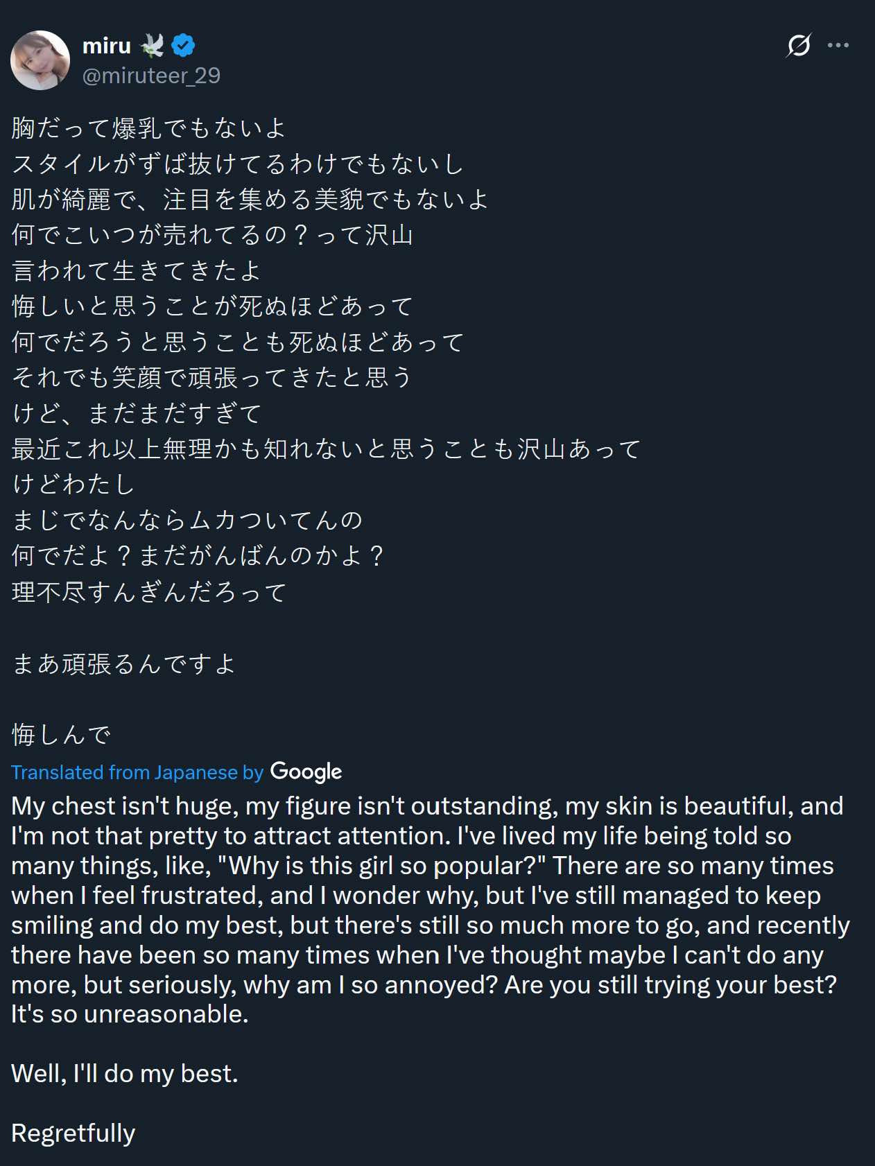 While fans are left speculating what may have triggered these self-critical outbursts, it is obvious that Miru is not feeling well.