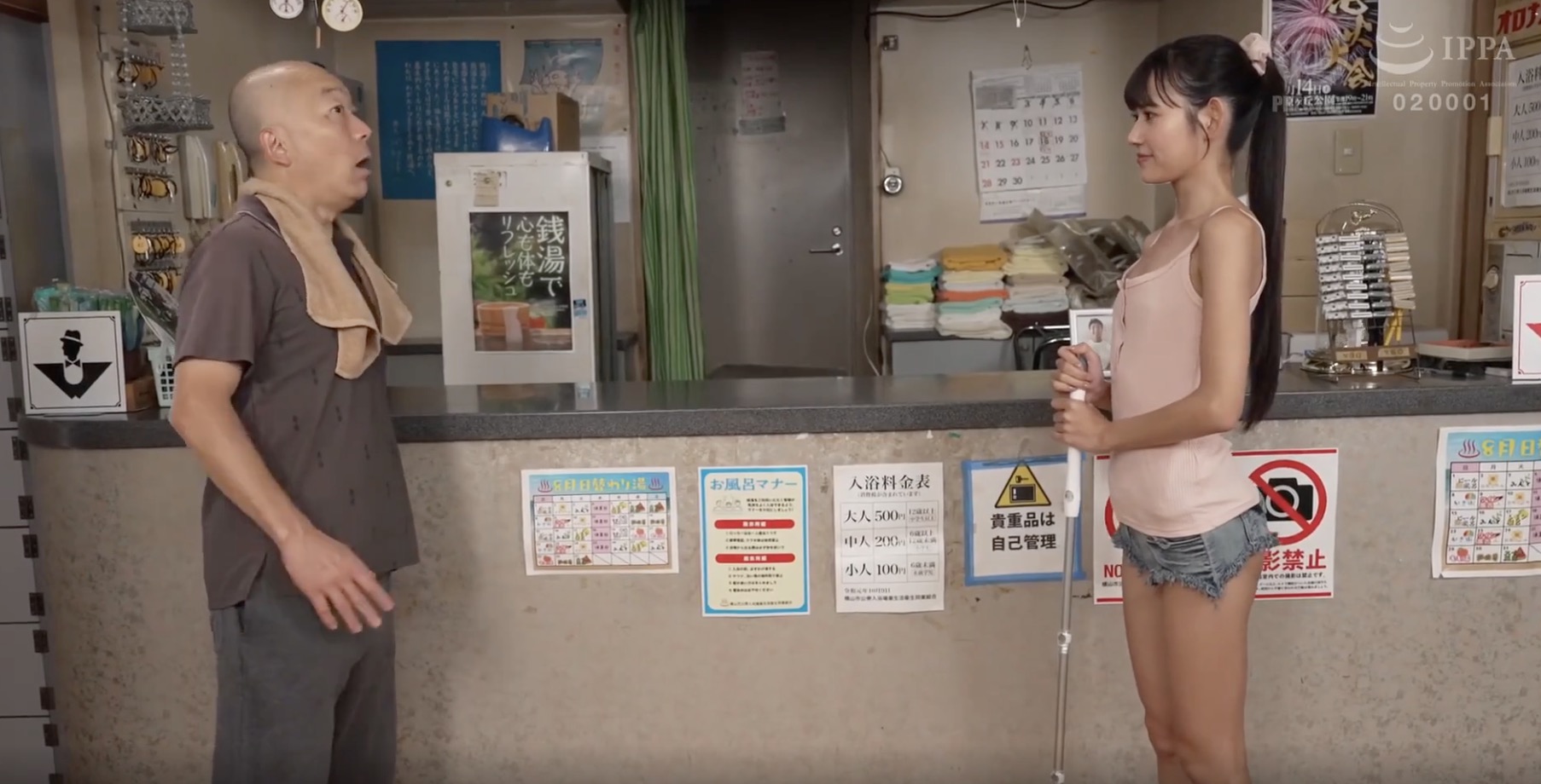We get to see Umi outside, going out with a middle-aged fatty. There is one interesting bit here where the two are having a drink while supposedly vlogging. A guy from another table addresses them and they do a bit of awkward small talk (they obviously don't know the two are going to have some nasty sex).