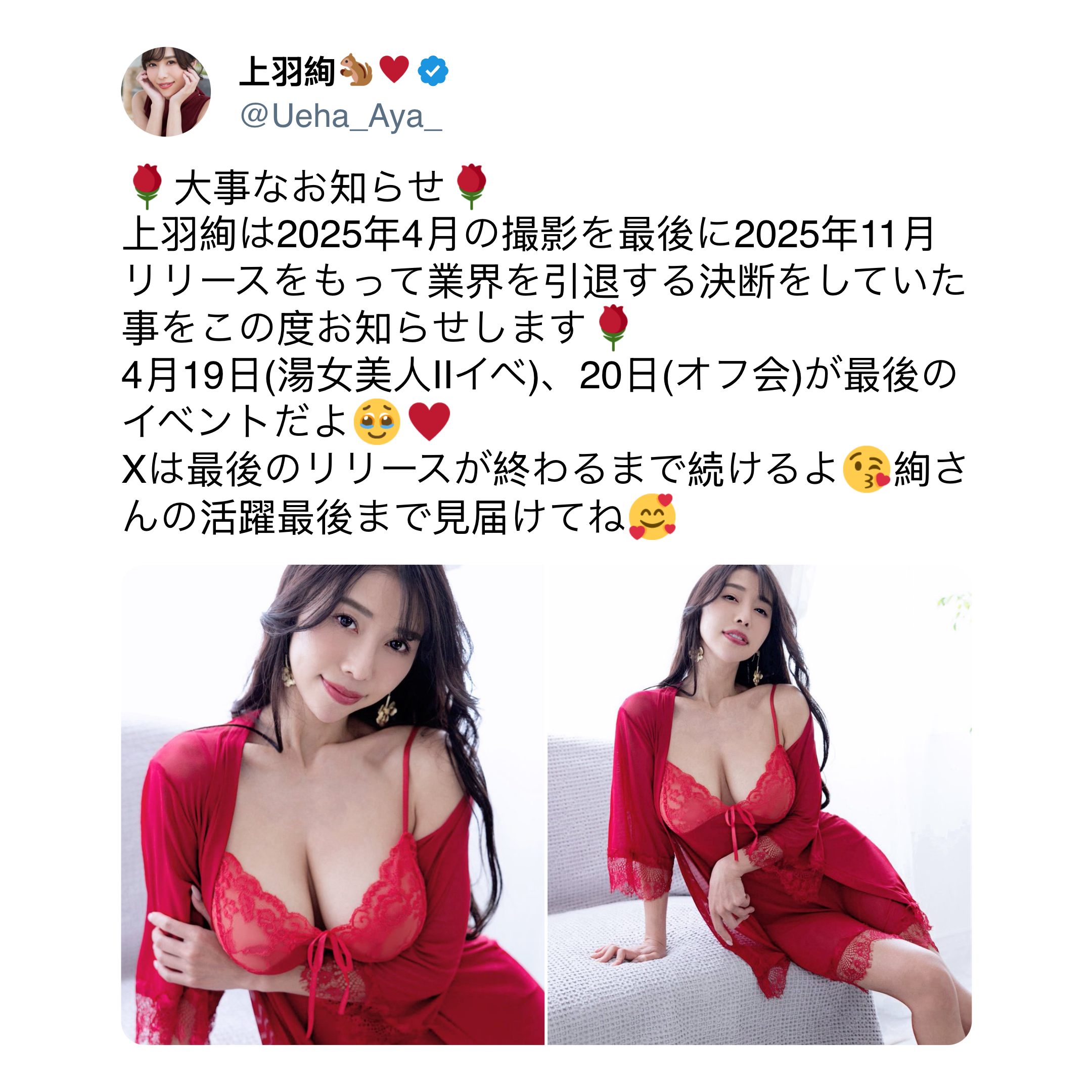 The impending retirement has got her fans hoping for the best case scenario in which she might reconsider her decision to retire down the line. Moving on to her final events, Aya has an event planned on April 19th and an offline meet-up on the 20th, which are both set to command a huge number of fans, in a way a last chance for fans to meet her before she disappears into thin air, "April 19th (Yume Bijin II event) and 20th (offline meeting) are the last events". But, the good news is her X (formerly Twitter) account is likely to remain active until her final a JAV release, "I will continue with X until the last release is over. Please watch Aya-san's performance until the end."