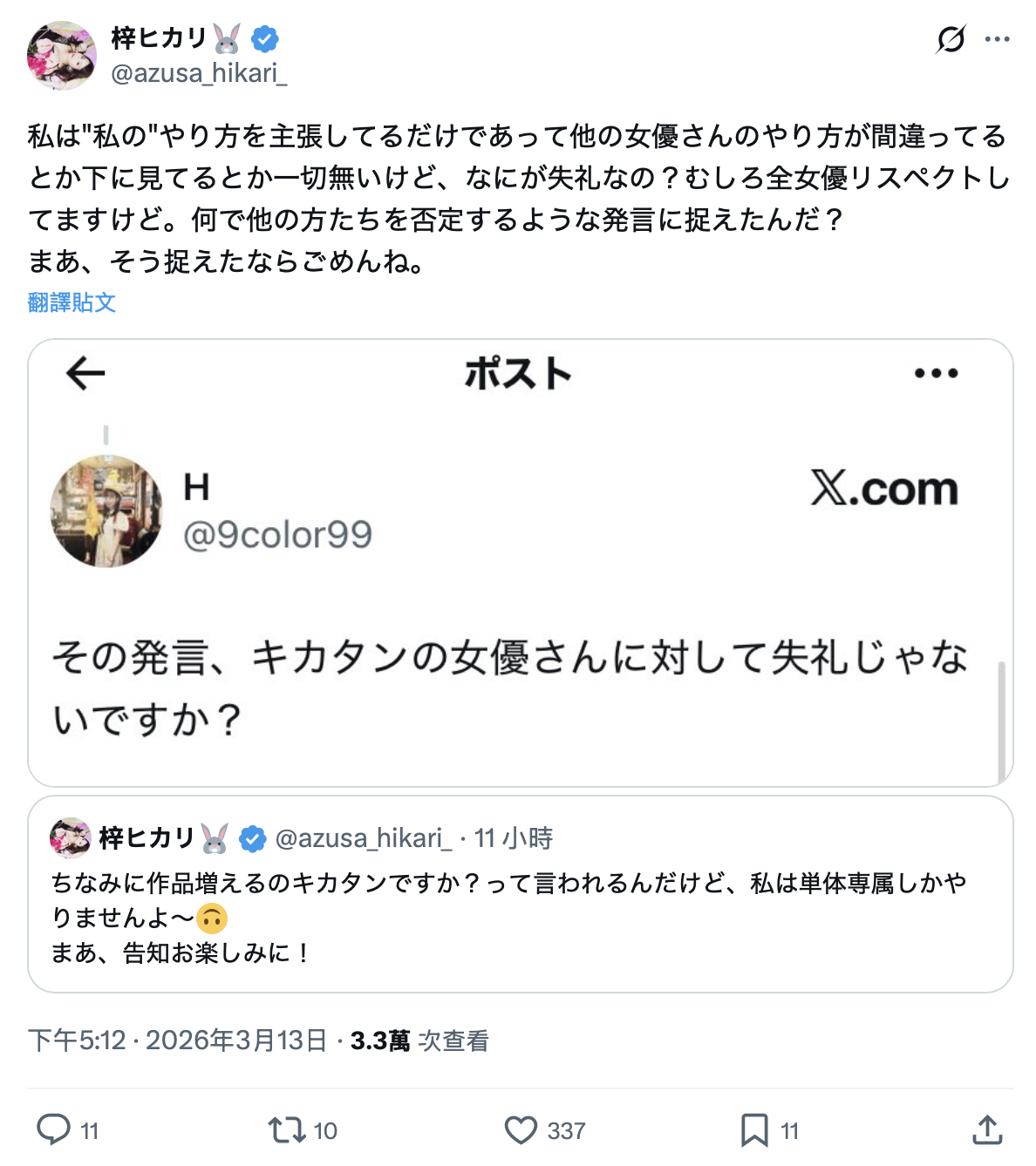Because not long after her clarification, a troll popped up, accusing Hikari of something rather unexpected: looking down on project-based solo actresses.