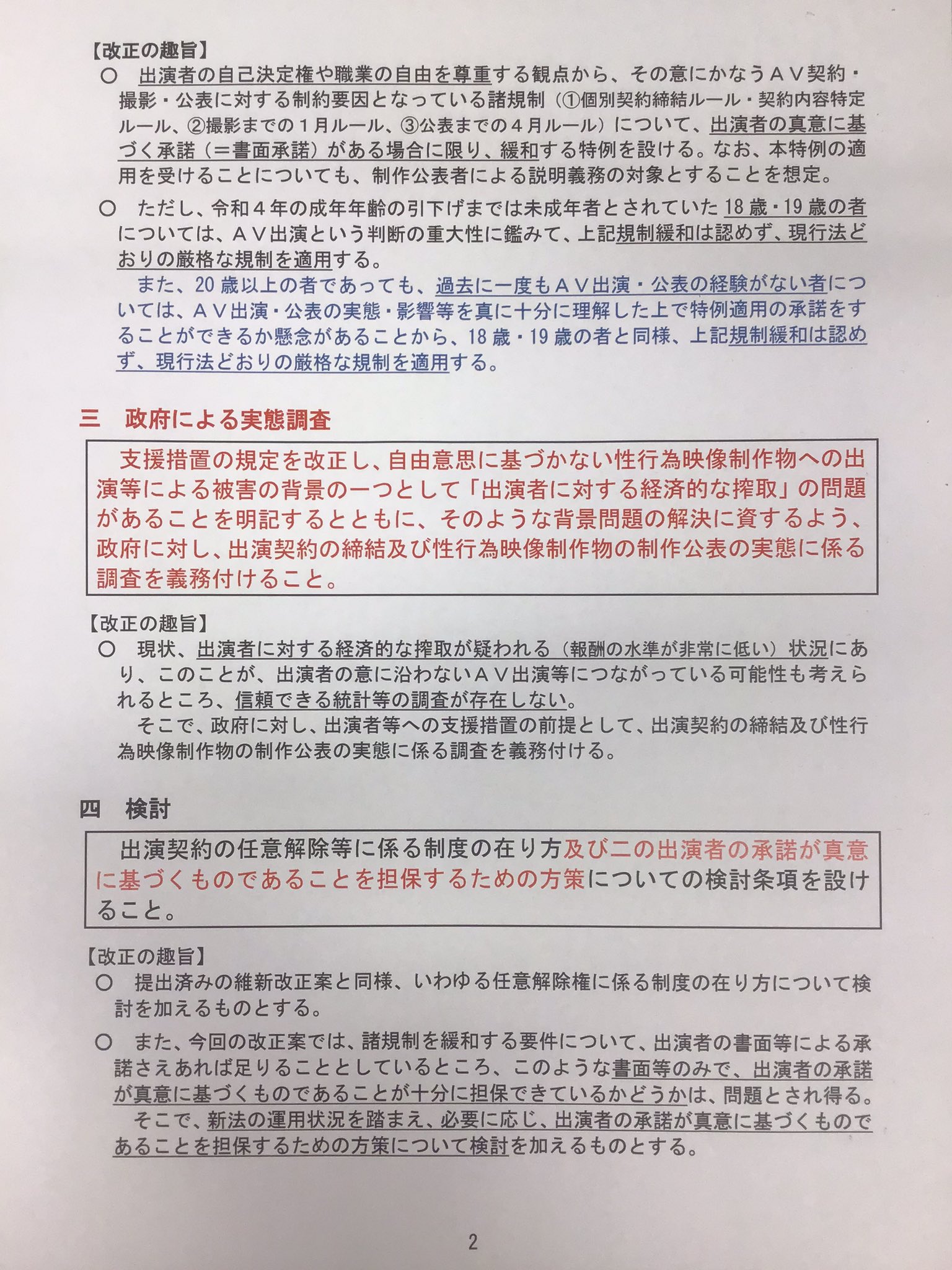 Revision in the provisions of the government's fact-finding support measures to clarify that one of the reasons for damage caused by appearing in sexual acts in videos in which the performer is not free to do so is the problem of "economic exploitation of performers," and obligate the government to investigate the facts regarding the conclusion of performance contracts and the production and publication of sexual acts in videos to contribute to the resolution of such background issues.