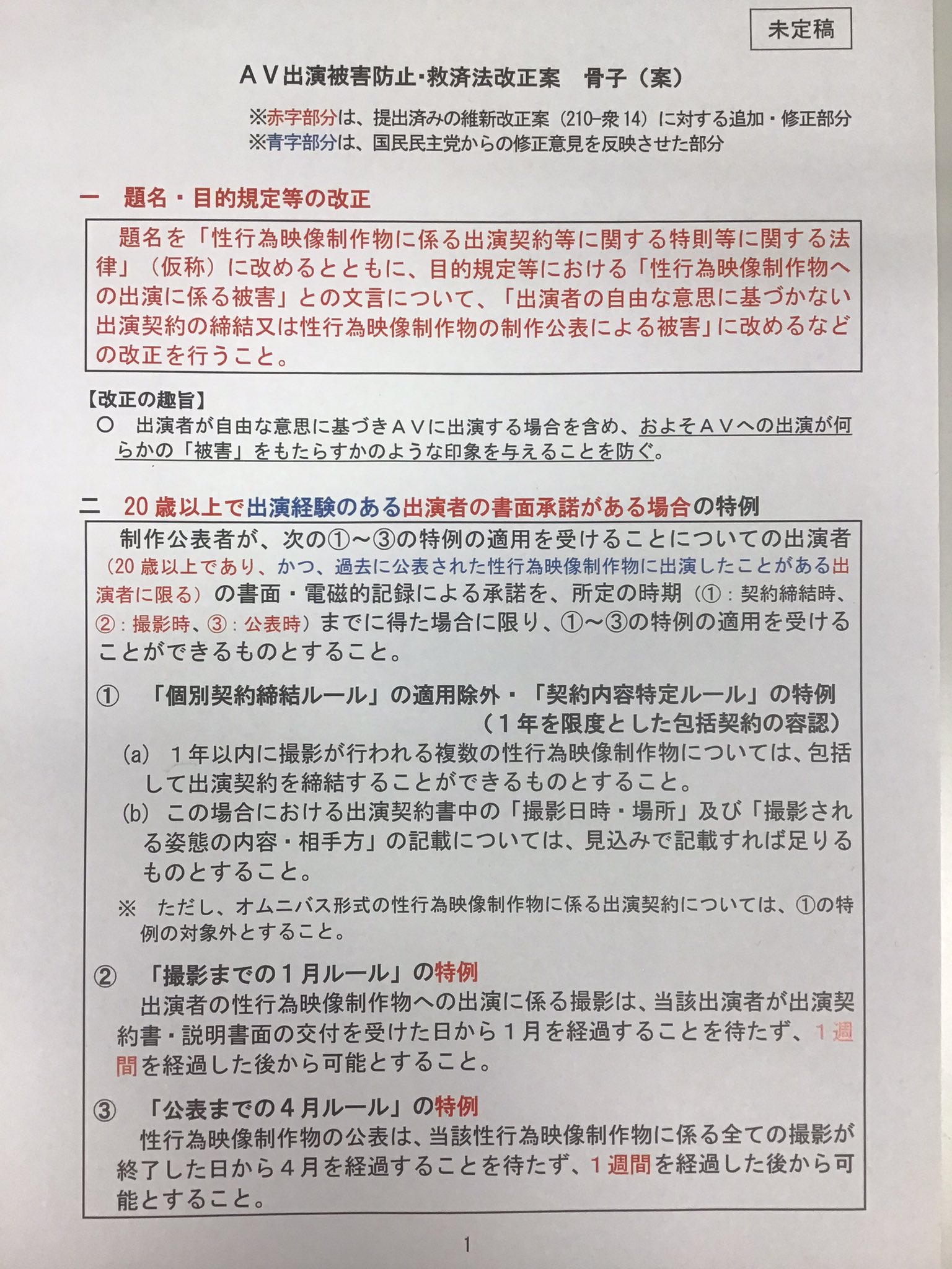 - New name: First things first, the title of the act has been changed to 'Law Concerning Special Provisions on Performance Contracts Related to Sexual Activity Video Productions' from its previous rendition and the wording in the purpose provisions, 'damage related to appearance in sexual activity video productions' is revised to the phrase 'harm caused by the conclusion of a performance contract' or the production and publication of a sexually oriented video production that is not based on the performer's free will.