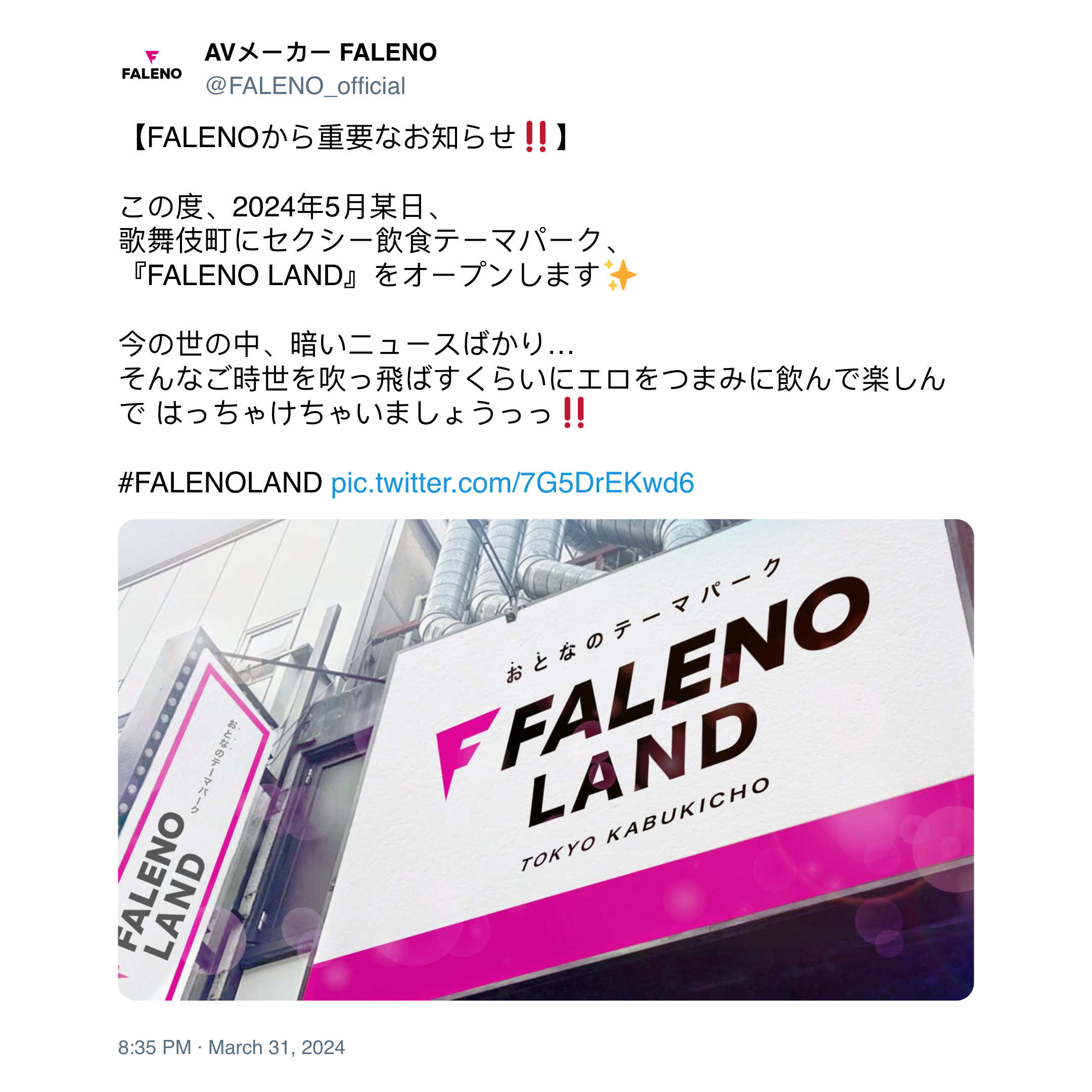 Enter Faleno. The SOD subsidiary studio decided to tweet up a storm on March 31st. The tweet? An announcement that would have had fanboys reaching for their wallets faster than one could imagine. The studio announced, "Important notice from FALENO! ! ] This time, on a certain day in May 2024, a sexy food theme park will open in Kabukicho. “FALENOLAND” will open. In today's world, there is so much gloomy news...Let's have some fun and drink some erotic stuff to blow away the news. Let's get crazy!" Literally, FALENO claimed to open it's very own SOD-styled theme park, set to debut this May and you’d believe the hype right? The tweet even came with a picture, and let me tell you, it looked suspiciously familiar. Like, an uncanny resemblance to a certain not-so-imaginary SODLand kind of familiar. We're talking near-perfect replicas, the kind that could make you question the existence of this themepark even! Let’s just say that it looked like a Photoshop job done by soom noob graphic designer at the studio.