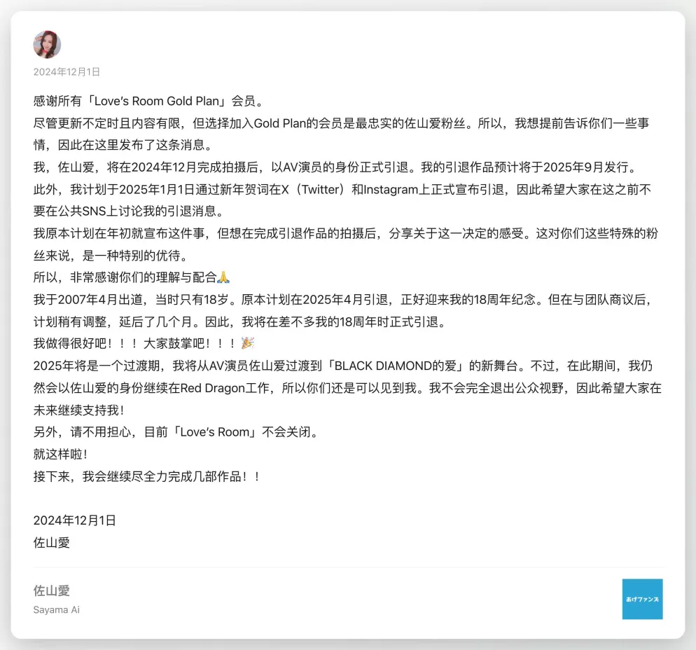 "I wanted to tell you something in advance so I posted this message here. I will officially retire as an AV actor after completing filming in December 2024. My retirement work is expected to be released in September 2025. In addition, I plan to officially announce my retirement on X (Twitter) and Instagram through a New Year's message on January 1, 2025" the actress stated.