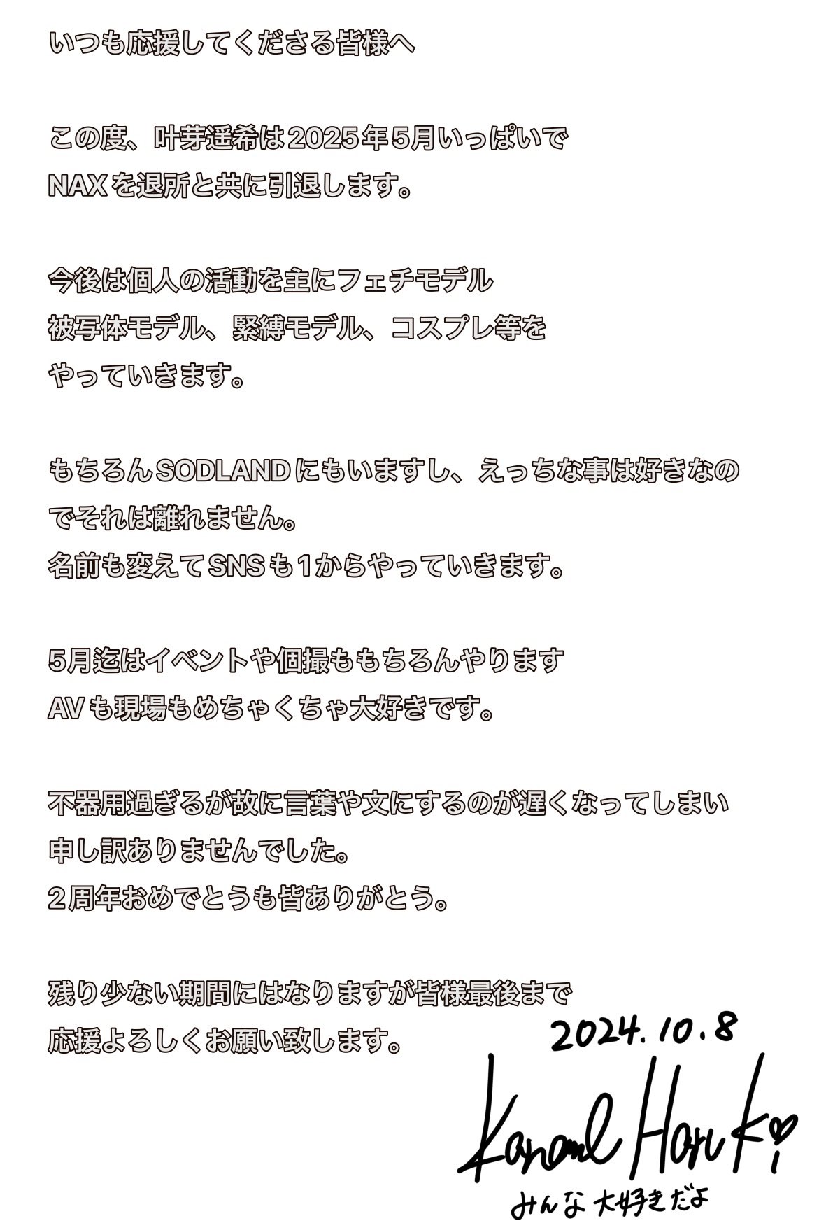 After retirement, she stated that she would take on a new name and concentrate on a career as an S&M model. She also intends to continue working as a server at SOD LAND for as long as the possibility exists, "To everyone who always supports me, I will be retiring from NAX at the end of May 2025," she wrote. "From now on, I will mainly be working as a fetish model, subject model, bondage model, cosplay, etc."