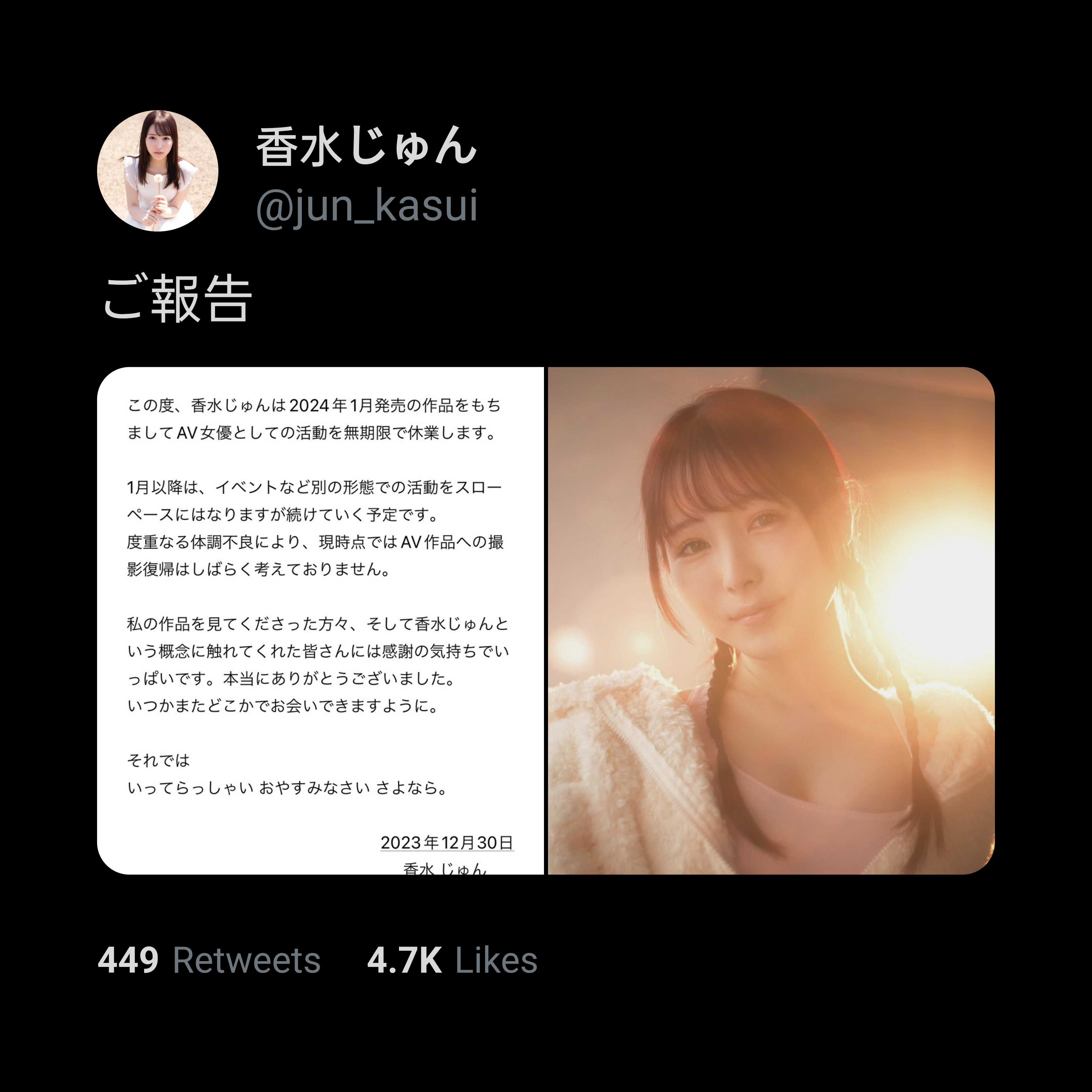 AV女優という肩書きを持って良かったと思うことは今までもこれからも一瞬もないけれど、ここで出会った人は皆素敵な人だし、ここでの経験はこれからの糧にします☺︎ pic.twitter.com/FTCFpyQXXo