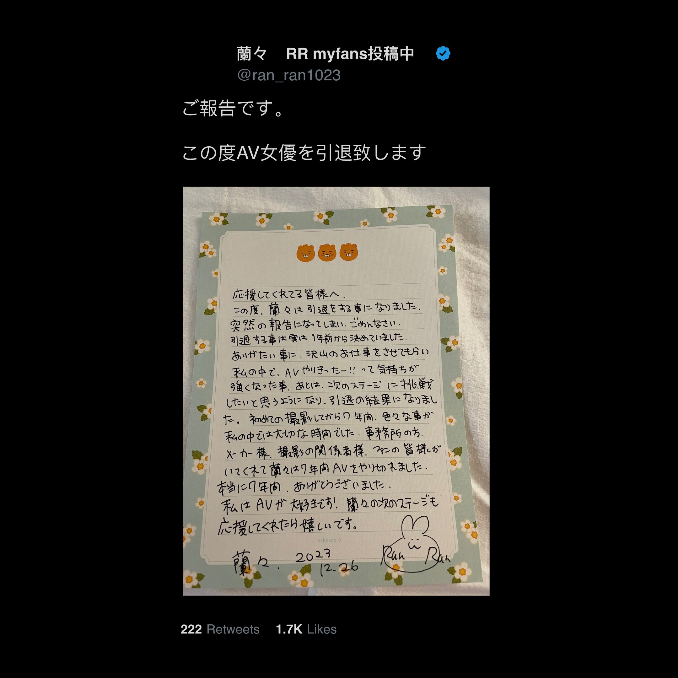 In another news we have RanRan calling it a day on her career. Nope, not the mainsream RanRan Fuji we all instantly think of, but the other RanRan — yeah, that one. Making an announcement via her X handle, raking in a crazy 70k+ impressions, the actress let her fans know that she’d had enough of filming JAV.