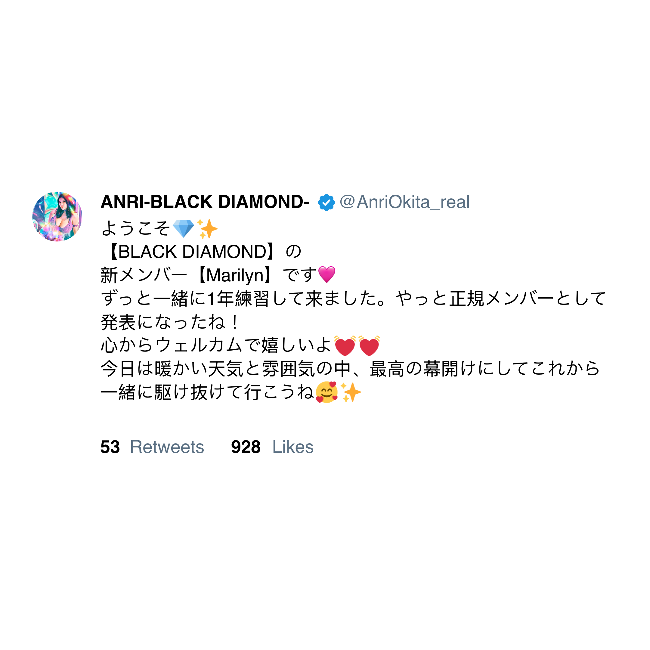 "Thank you to everyone who came to Shibuya Ai Vision and everyone who watched the live broadcast," she tweeted, her excitement palpable. "As announced on the broadcast, I will now be active as Marilyn of BLACK DIAMOND."