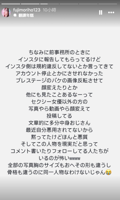 In another story she wrote, "By the way, when I was with my previous agency, I reported him to Instagram but they said he didn't violate their terms and conditions, so they couldn't suspend the account. He inverted the image on the Prestige package and changed my face, and I've seen other things like that. He posts photos and videos of people other than porn actresses with their faces changed. Judging from his writing, I think the person behind it is probably an old man. I haven't been abused recently, so I've kept quiet, but it's really malicious. And it's scary that there are people who think this person is real and write comments and follow him lol. All of the photos have different breast sizes and belly button shapes, and different bone structures, so there's no way they're the same person."