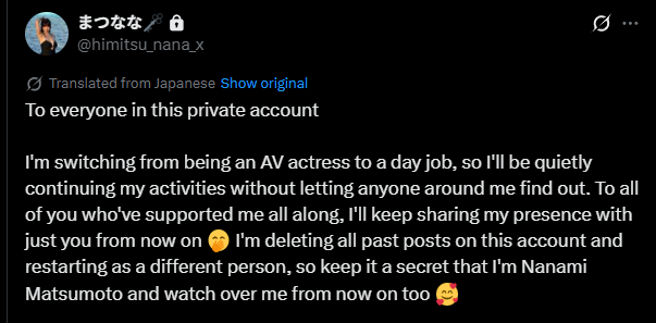 “To everyone in this special account,” she wrote, “I’m switching from being an AV actress to a day job, so I’ll be quietly continuing my activities without letting anyone around me find out.”