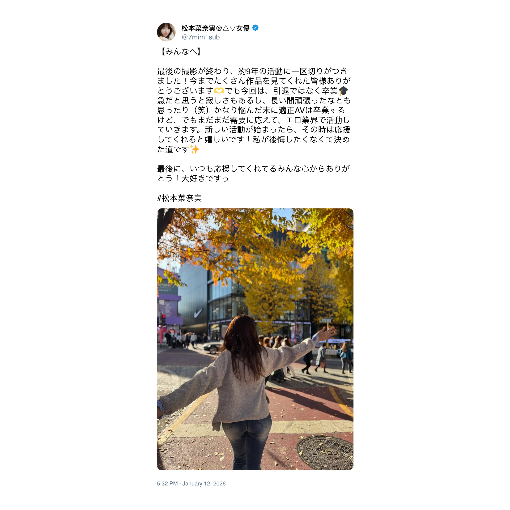 Nanami went on: “To all of you who’ve supported me all along, I’ll keep sharing my presence with just you from now on. I’m deleting all past posts on this account and restarting as a different person, so keep it a secret that I’m Nanami Matsumoto and watch over me from now on.”
