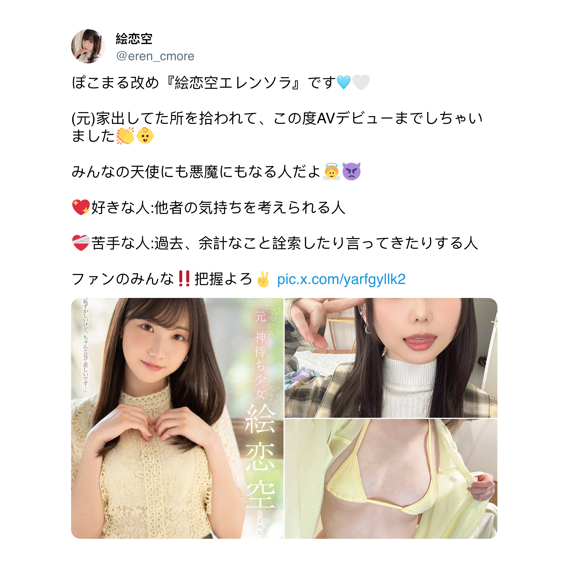 Nana has taken up an avatar, she’s even rebranded herself as Ellen Sora! Nana, or should I say, Ellen, gives a glimpse into the backstory enough to sell out a JAV that she is a runaway girl who does JAV for a living. Classic Hollywood backstory, right? But with Nana's name attached, the expectations are high with this one! "I'm Pokomaru, aka "Ellen Sora" I was picked up after I ran away from home, and now I've made my AV debut. Depending on the person, I could be an angel or a devil. People I like: People who can consider the feelings of others. People I don't like: People who have asked me questions or said unnecessary things in the past"