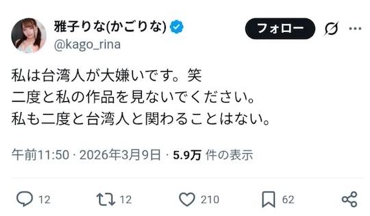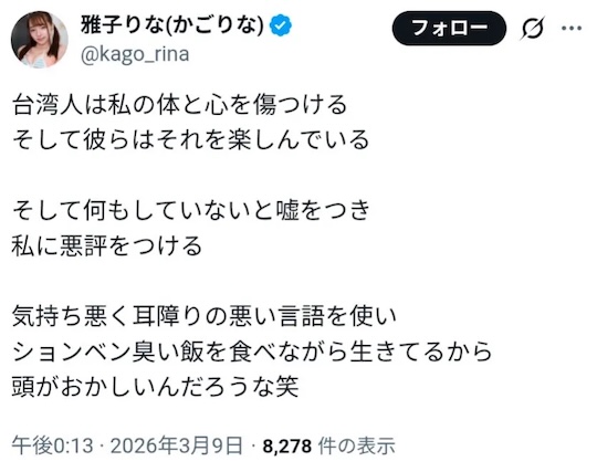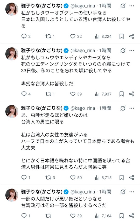 In a since-deleted series of tweets, Kago went on what can only be described as a bizarre and deeply troubling rant on X, one that might not sit well with her overseas fans. These tweets reportedly included statements directed at Taiwanese fans in particular, with such bigotry that’d make it hard to believe it came out of her mouth, but rather, that her X account was compromised.