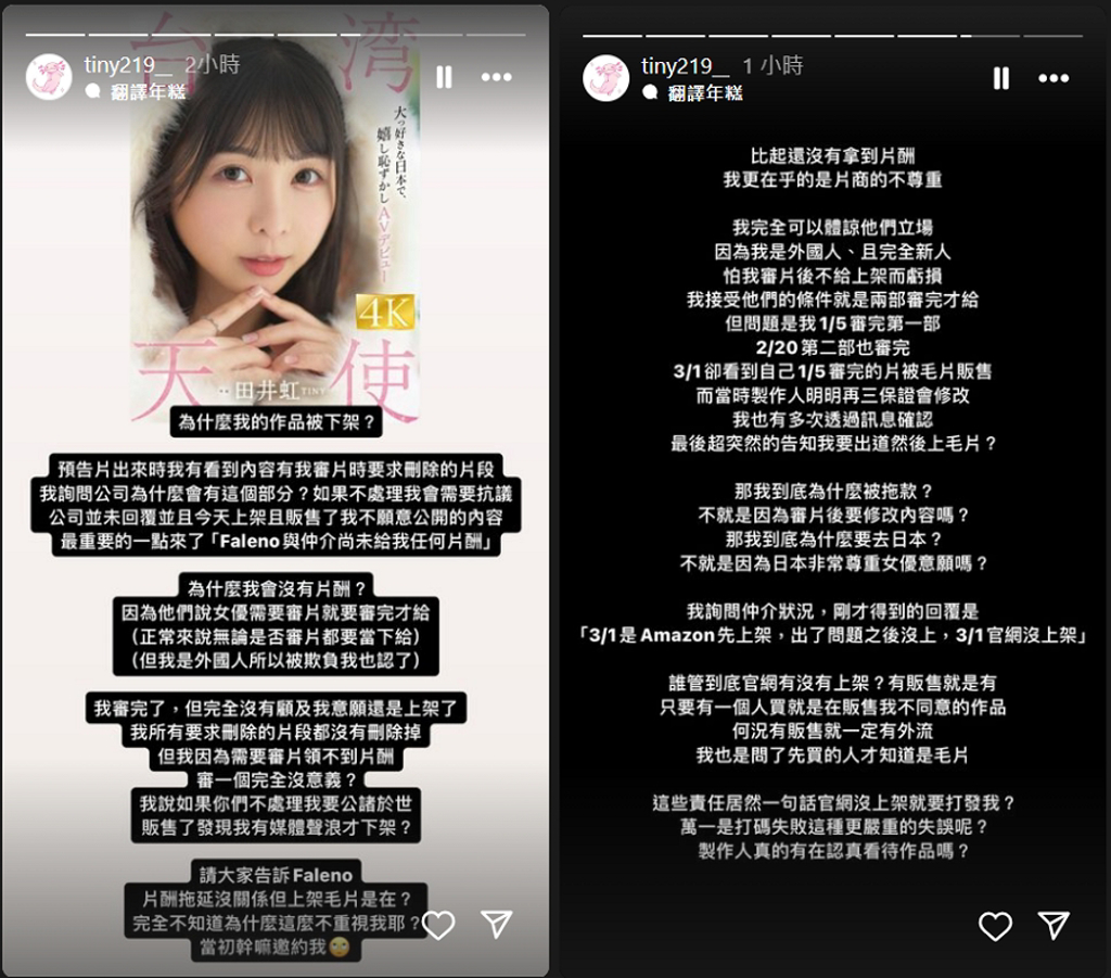 First of all, before wanting to turn to a Japanese AV actress, Tai Jinghong aka Tiny used to be quite a famous model with nearly 50,000 followers on Instagram. She was teased to debut for Faleno this March. But the story starts to get complicated when the actress personally reviewed her movie. As per her testimony, there were couple of scenes where she felt dissatisfied and even though she asked the producer to edit them, in the end no action was taken. "I had it reviewed, but it was still on the shelves without any regard to my wishes. All the clips I asked to be deleted were not deleted. But I couldn't get paid because I had to review the movie. It's pointless! I said if you don't deal with it, I'm going to sell it to the and find out that I've got a press campaign before I take it down? Please tell Faleno, It's okay to delay the paycheck, but it's not okay to put the movie on the shelves. I don't know why I'm not taken seriously at all. Why did you ask me for a contract in the first place?"