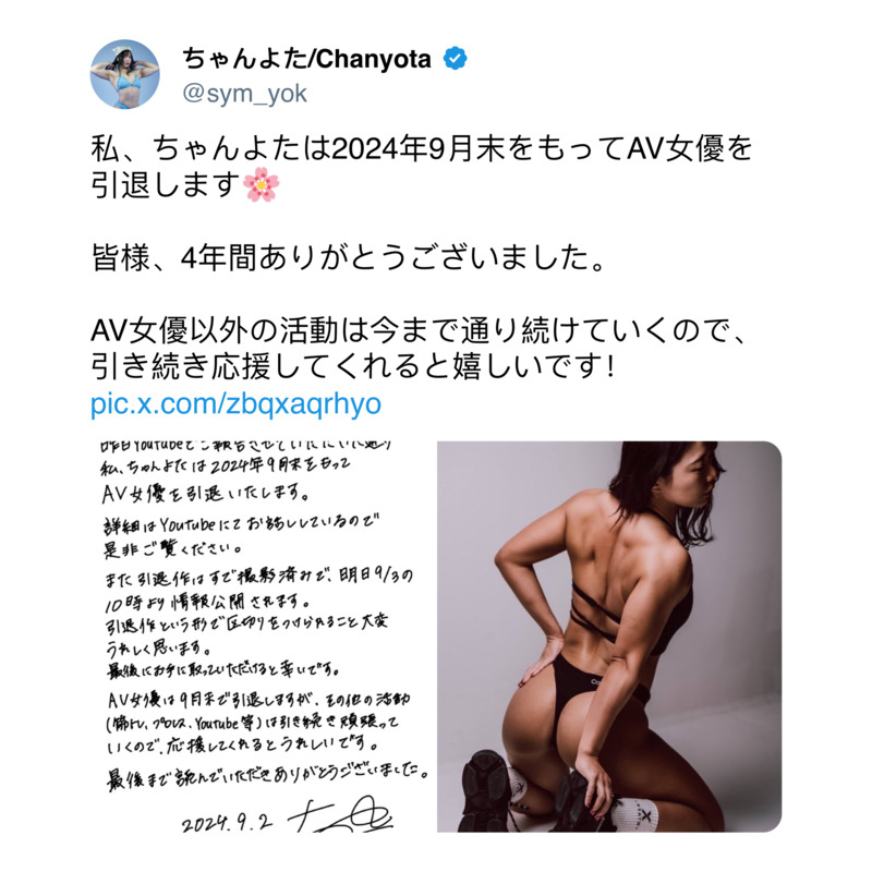She mentioned, "To everyone who always supports me, as I announced on YouTube yesterday, I will retire as an AV actress at the end of September 2024. I have talked about the details on YouTube, so please take a look. My retirement work has already been filmed, and the information will be released tomorrow, September 3rd, at 10 am. I am very happy to be able to end my career as a retirement worker. I hope you will pick it up at the end."