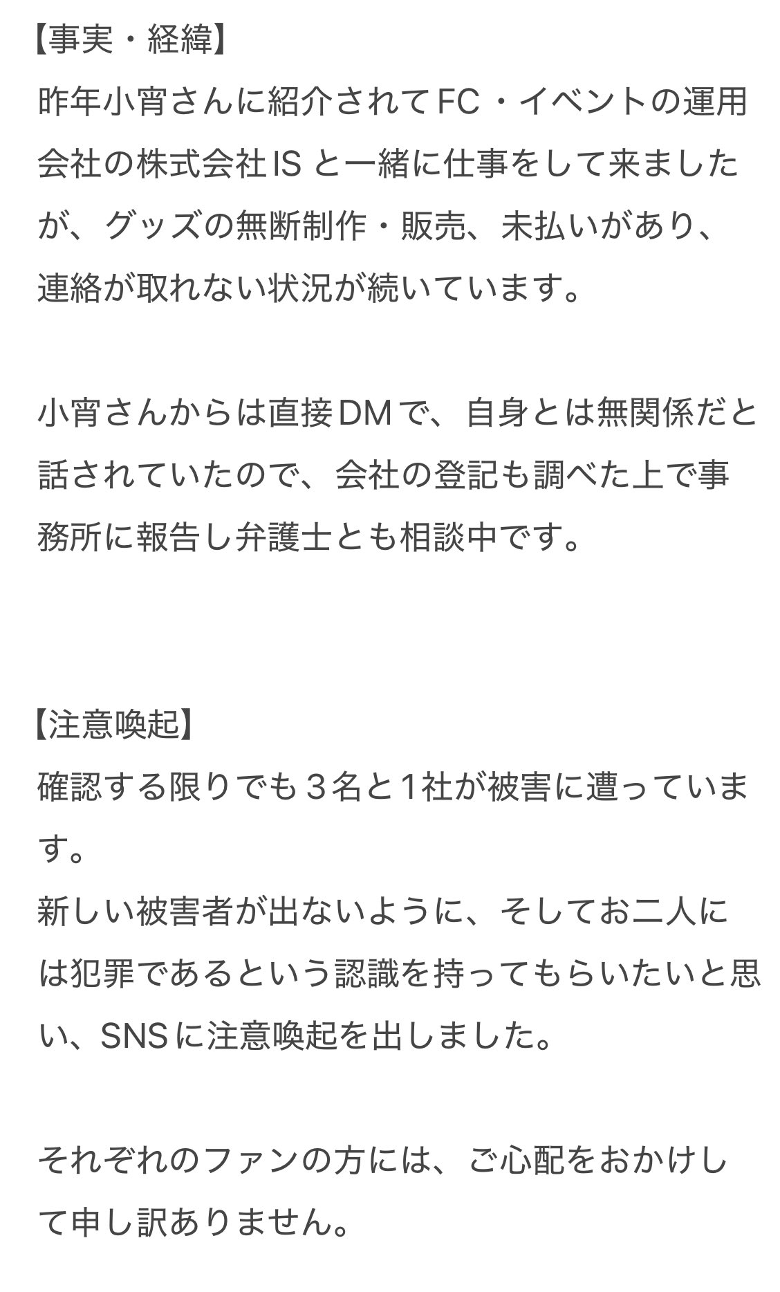 「先日引退を発表した人気ΛV女優 小宵こなんさんが、同業の人気女優 河北彩花さん/七瀬アリスさん等にSNSコラボを口実に接近し、その後旦那が代表を務めるイベント運営会社を紹介。その会社が河北さんの“着用下着”や七瀬さんのグッズを無断作成&販売してトラブルになっている件をまとめろ」とのDMを… https://t.co/2Vic6fCguk