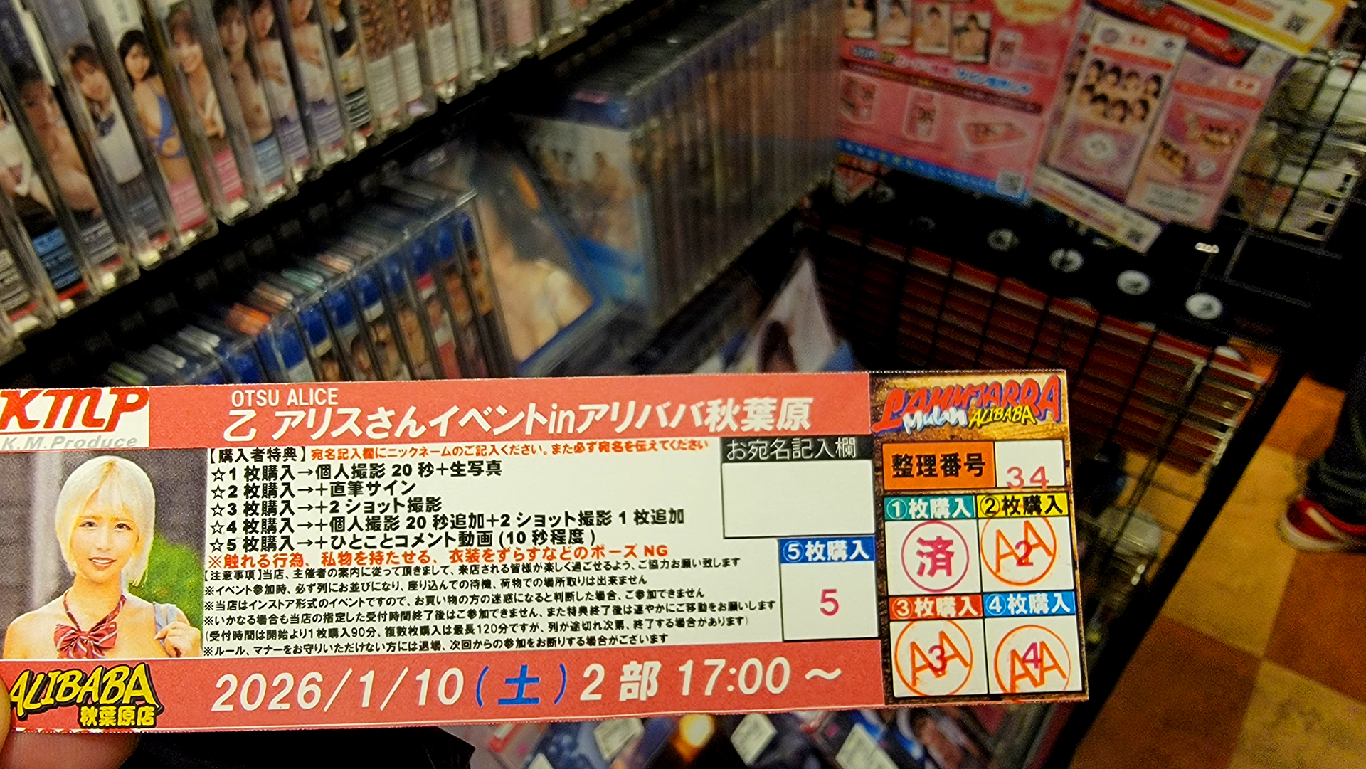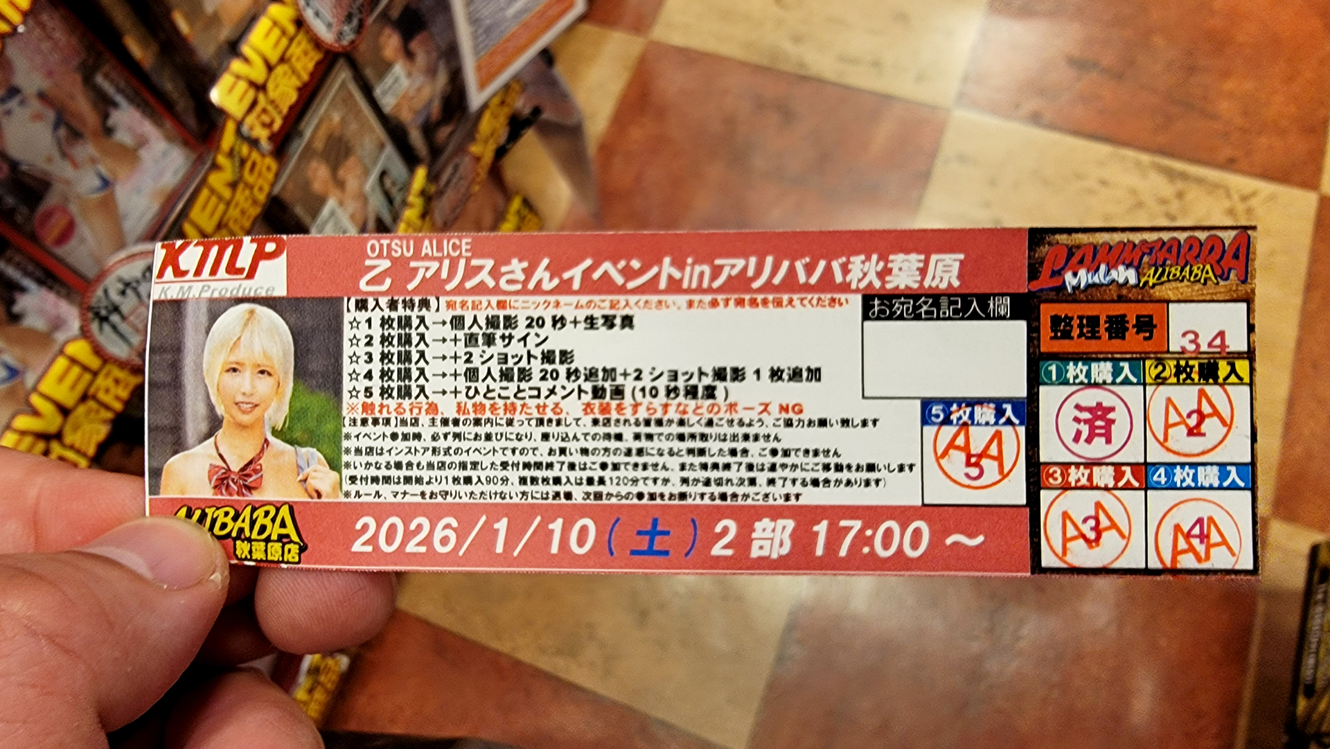 As both Yu Tano's and Alice's second event started at the same time I arrived at Alice's event much later than I previously did at Part 1. Despite arriving late they still had tickets for Alice's event and I got ticket number 34 surprisingly. I did end up being number 11 in line and a few people came after me.
