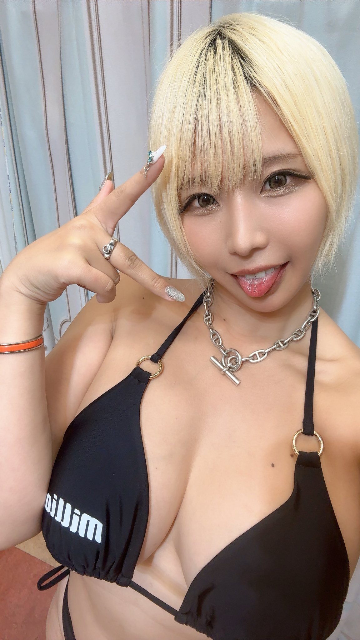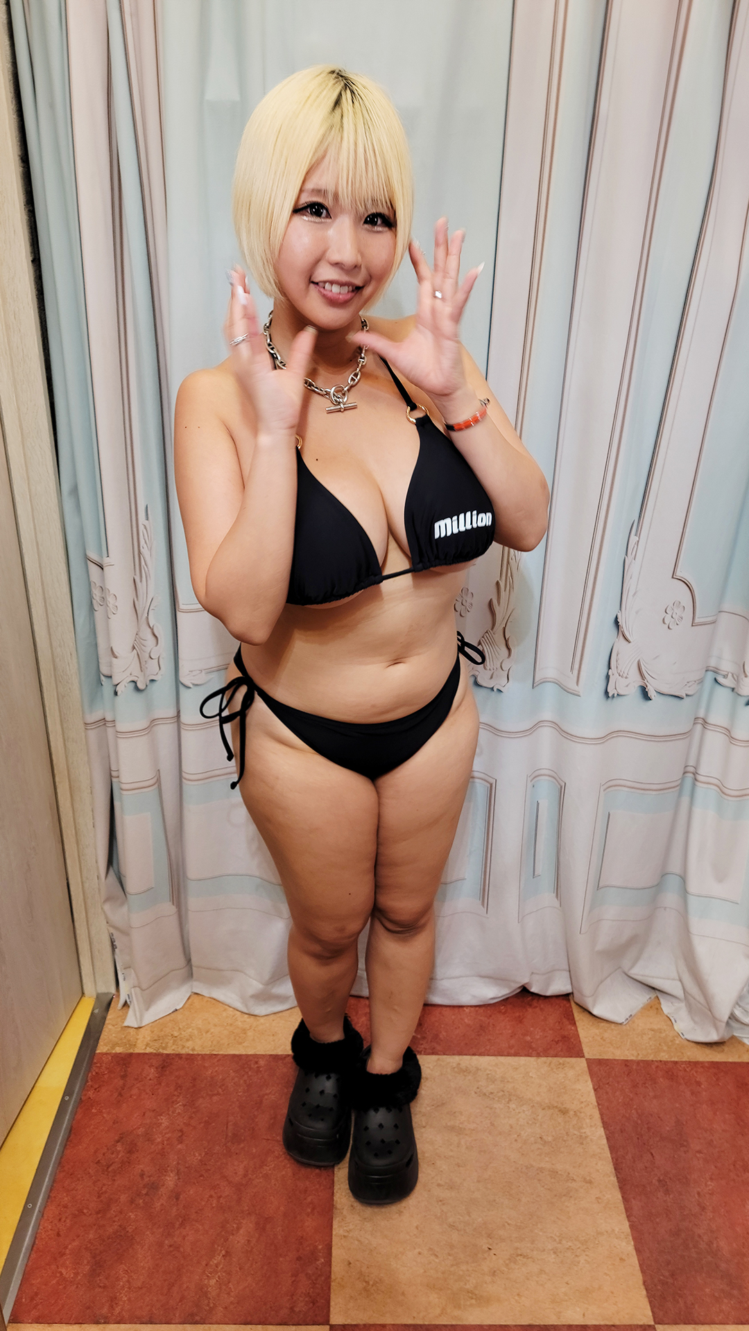 The curtain is lifted and once again I see the sexy big breasts tan gyaru Alice Otsu in front of me. She had a bikini change to a black KMP Million branded bikini. I honestly preferred the pink bikini but this one made Alice look sexy as well.