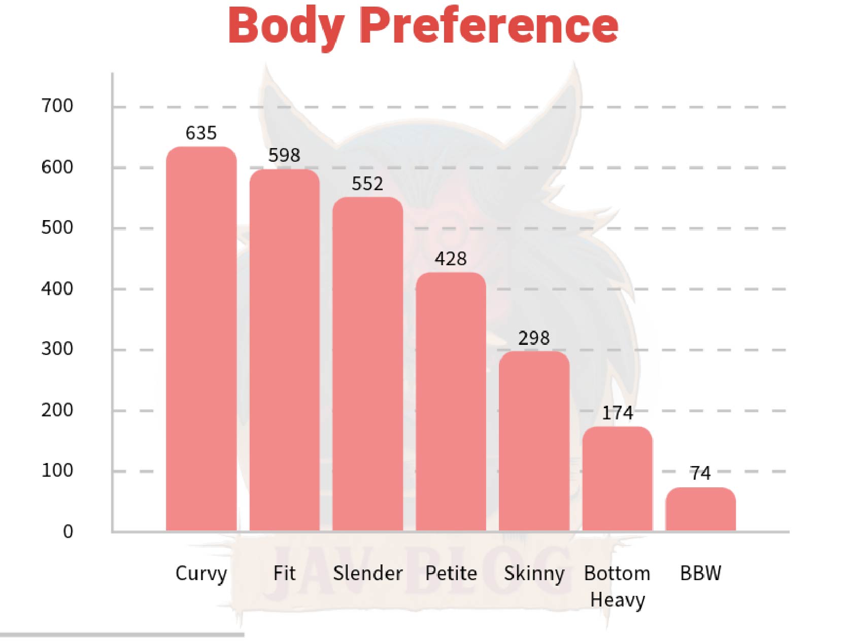 For Body Preferences respondents picked Curvy as number 1 with over 600 votes, fit as number 2 with nearly 600, and in third was Slender with over 550 votes. Skinny came in fourth and I’m interested if this is a difference in culture compared to domestic fans. Other cultures, like Japanese, favor skinnier and slimmer figures. Meanwhile, more Western cultures favor more fuller and heavier figures. While our survey demographics include people from both cultures, the results favored Curvy but not too curvy with BBW at dead last. Fit and Slender are also at the top so it’s hard to make sense of the results looking at it like that. In the future maybe it would be good to include Body Weight preference too.