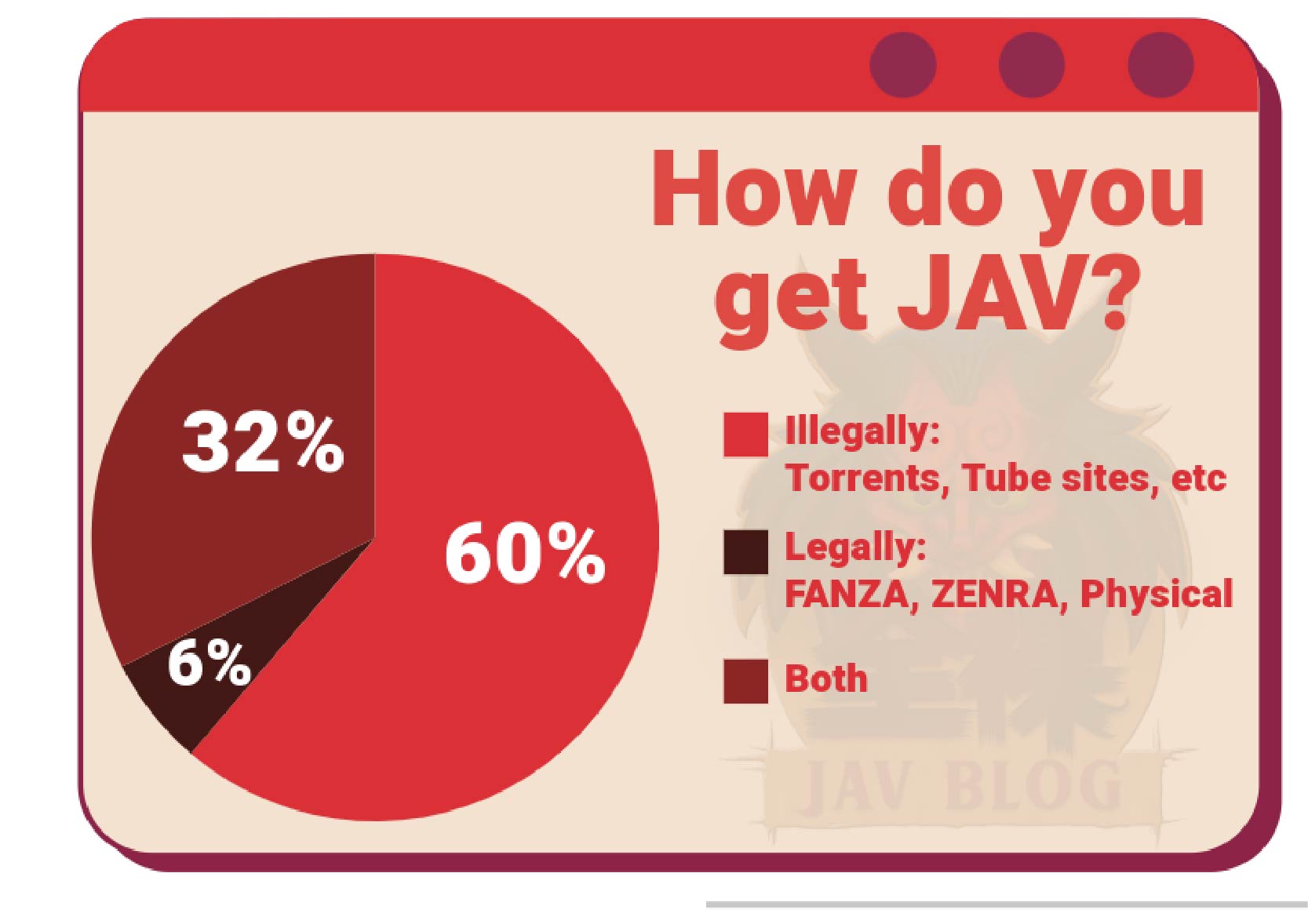 While the majority pirate JAV, there is also a large portion paying for their adult goods as 32% answering that they get JAV from both illegal and legal sources. Not only that, an ardent 6% answer that they only get JAV from legal means. These are the ones that the industry loves. I will just say that you are a better person than me. And as always, I point to fans to support legal sources of JAV and porn in general with sites such as ZENRA.