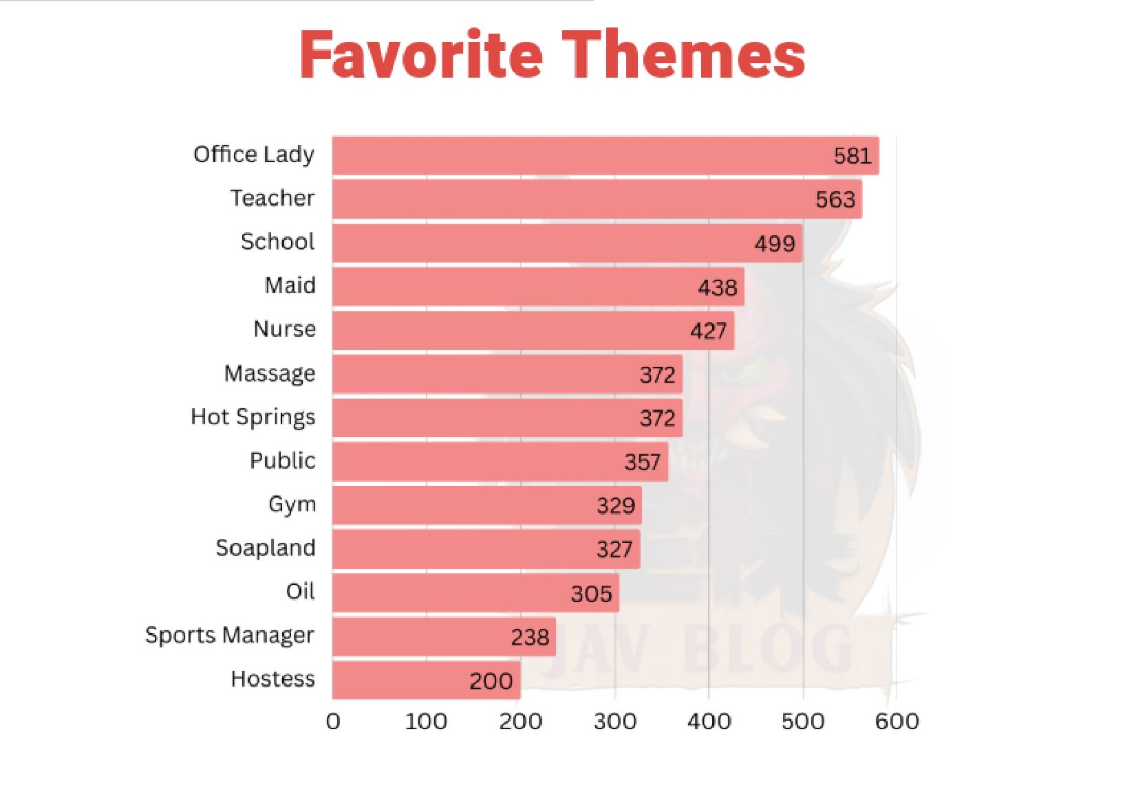 Over on the Theme side, the obvious trio stood at the top of the pack with Office Ladies at number 1, Teachers at number 2, and School at number 3. Office Ladies and Teachers to me are the two sides of the same coin or even the same side with just different names. Outfit-wise they are pretty much the same with formal clothes and both usually feature older women. The key differences being that Teachers are usually seen as in a more superior position to their students, while Office Ladies are usually employees. Either way both being on the top tracks with how Milfs sit on top of the Favorite Genre list.