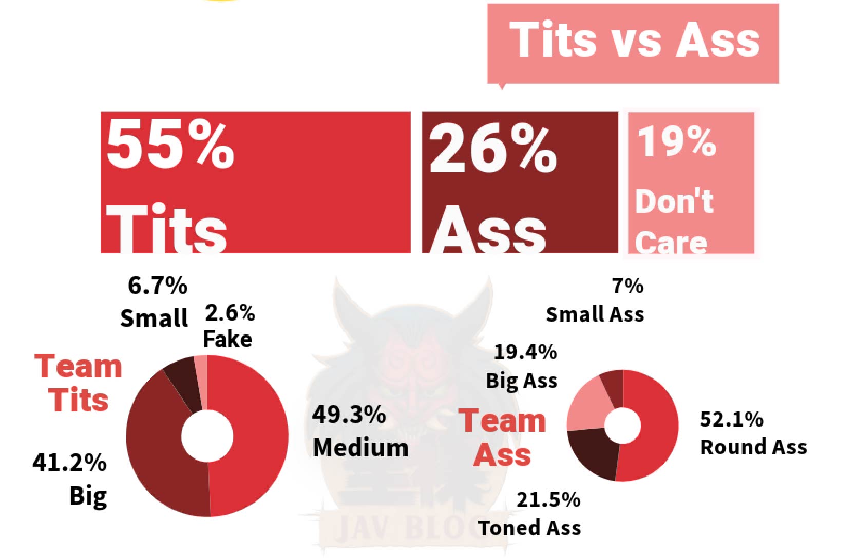 The War between Tits and Ass continues but it seems like a futile one with Tits winning 55% of the vote and Ass only taking 26%. This is a Boobs Man’s world and we are just living in it. Meanwhile 19% didn’t want to take part in the fun and remained neutral with the Don’t Care option. The two sides could be broken down further by their preferences. For example, on Team Tits people picked Medium sized tits as their number 1 preference with big tits coming in second and small tits as a very distant third. This might be a Boobs Man’s world but it doesn’t belong to the biggest.