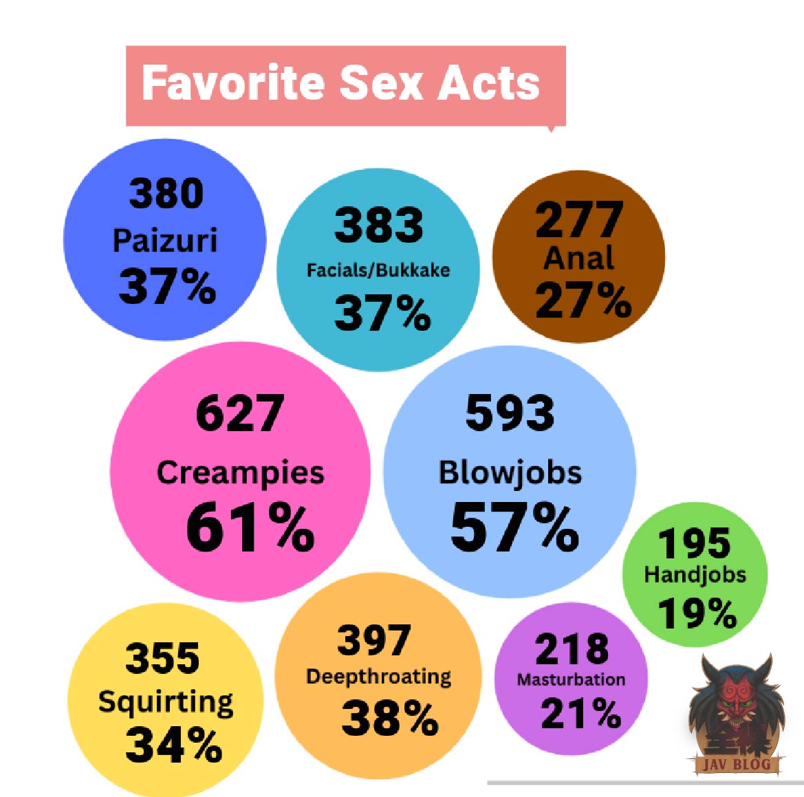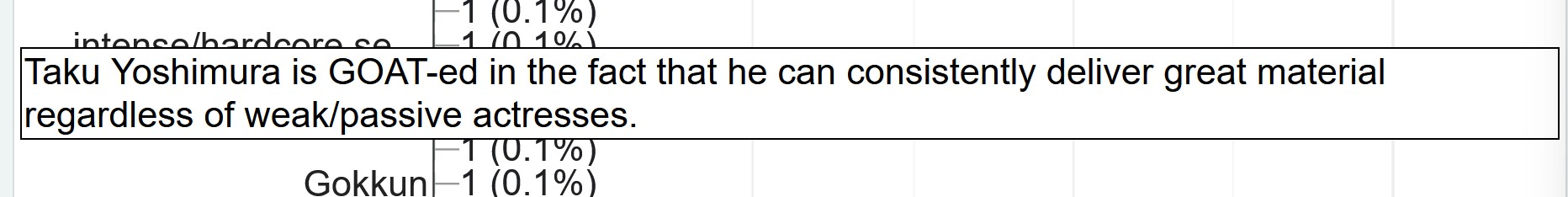 For Sex Acts the top three were Creampies, Blowjobs, and, I almost gagged when I saw this, Deepthroating. As a deepthroating fan I am quite surprised to see that as number 3 as the hardcore leaning act seemed to be more niche and too rough for the general to me. A pleasant surprise. Ahead of it are creampies and blowjobs; two acts that are while popular sadly hampered by JAV so much. Blowjobs are obviously limited due to mosaics with many fantastic pole suckers in JAV not able to get their full appreciation due to those darn pixels.