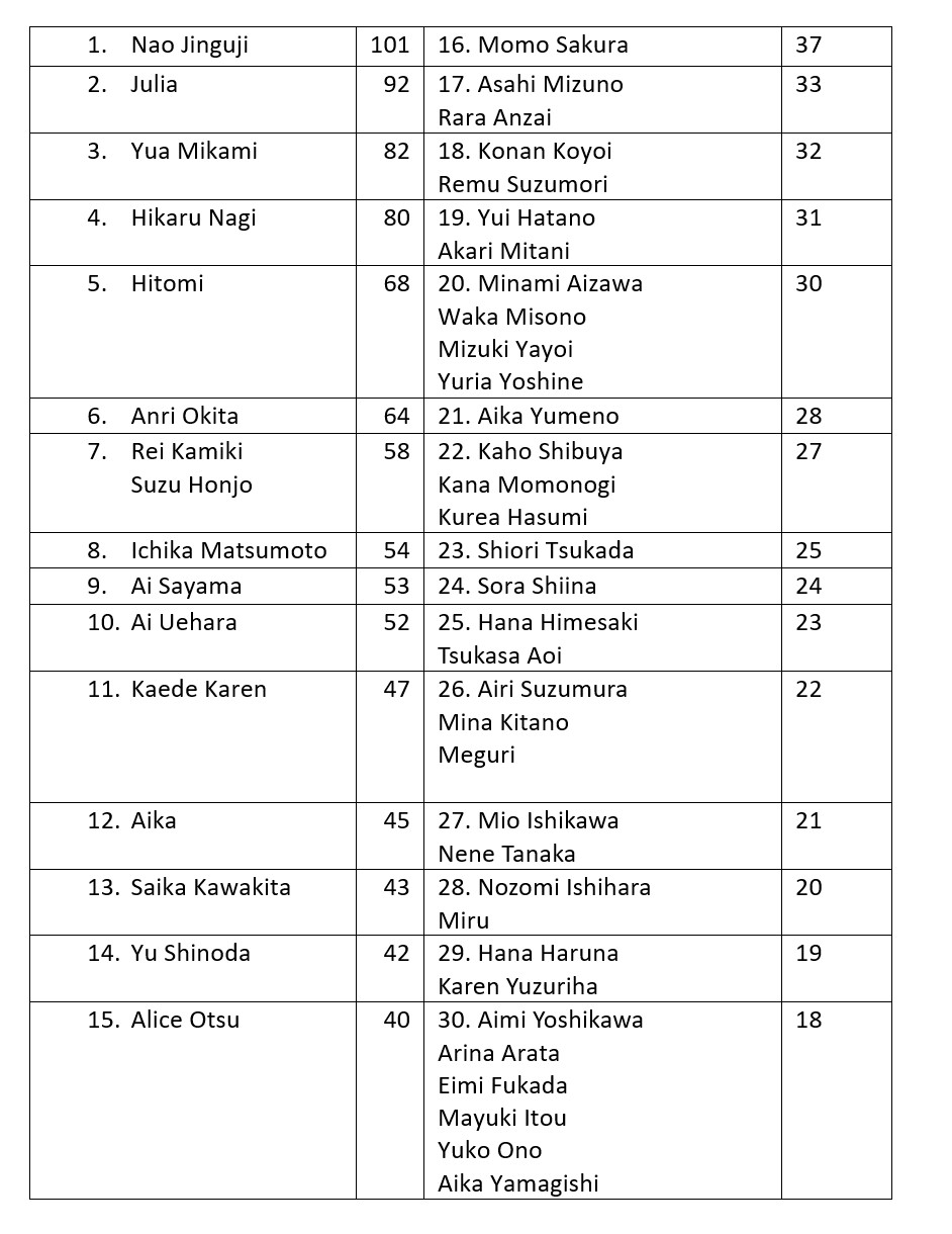 I felt Nozomi and Yamagishi were a bit too low, but happy that they're up there. I figured they would be near the 30 neighborhood with Waka and Akari.