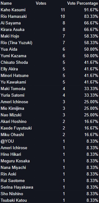 As I've done before, included is the vote percentage this time around. Both Kaho and Rio were safely in there with the cutoff being 9/12 votes.
