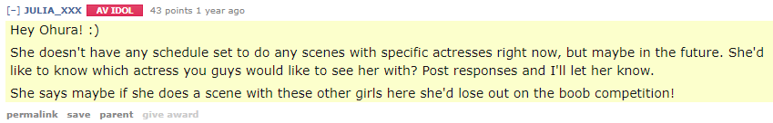 Hey guys, Oppaira here. At this point I'm pretty sure everyone knows Julia is one of my all-time favourite actresses even despite her being painfully vanilla. She's beautiful, kind, and just generally warms my heart. One thing people might not know is that several years ago some JAV actresses did an AMA on reddit, and Julia was among them. I got the chance to ask her a question and I asked if she would consider doing lesbian. Well, the proof is in the pudding, as they say, so here's the screenshot from that AMA.