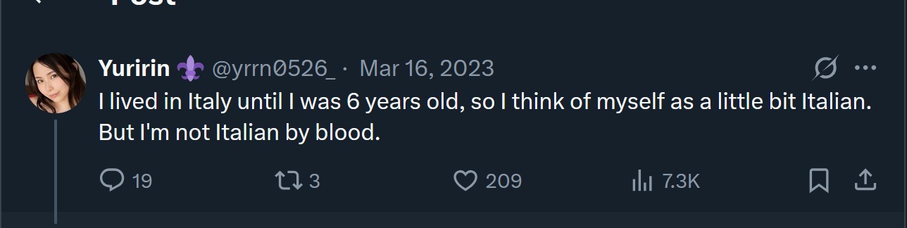 Some girls like the top heavy Yuria Yoshine posted her background on the sly. Putting in her Italian background on her personal sub account before removing it. Now this is an interesting case as she was born and raised in Italy, but is racially Japanese. Now, it is raising a whole philosophical discussion about race and ethnicity and what makes a person Italian, but I digress. She was born there, raised, knows the culture, and most importantly, considers herself part Italian. So I’m keeping her here; Yuria Yoshine, not a Hāfu but part Italian.