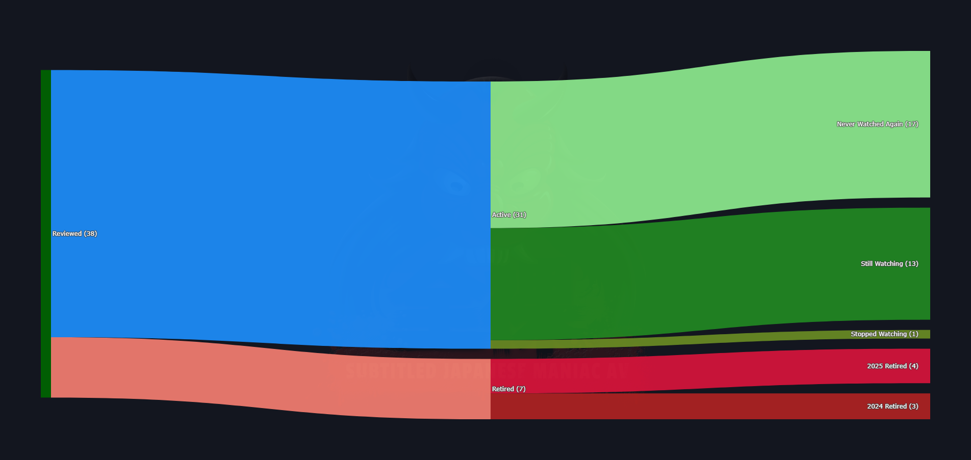 Most interesting is that I have actual identical numbers on never watched again and still watching compared to 2023. So that is, the same number of actresses caught my eye, so the only shift between the two years is just in the retirement numbers vs actresses I naturally stopped caring for. Either way, healthy numbers across the board with plenty to watch.