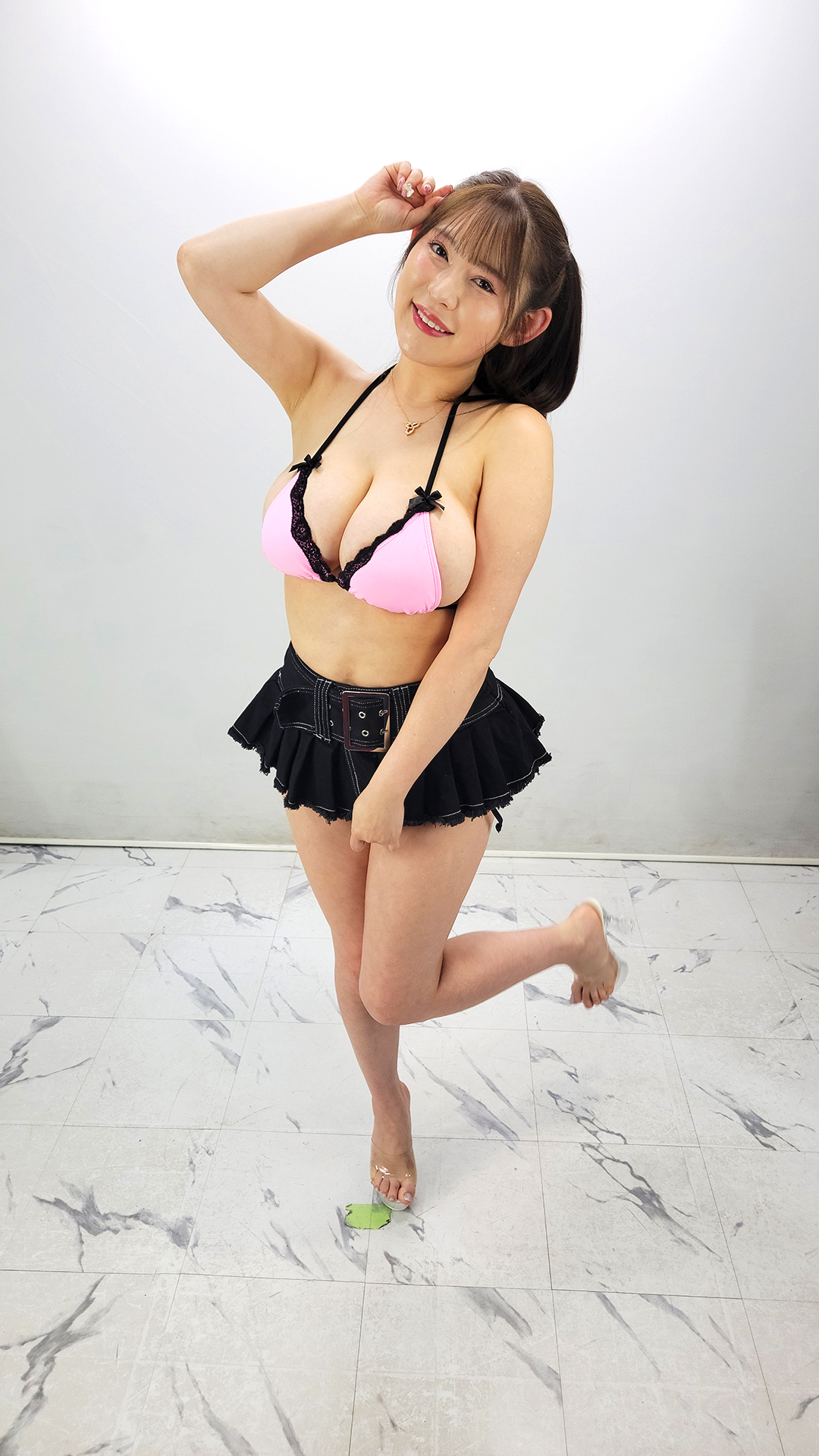 Ren came out in a pink swimsuit with cute black lace on the top with her breasts spilling out on the side while wearing a black mini skirt which barely covered her butt as I watched her butt jiggle a bit as she walked toward the stage in clear heels.