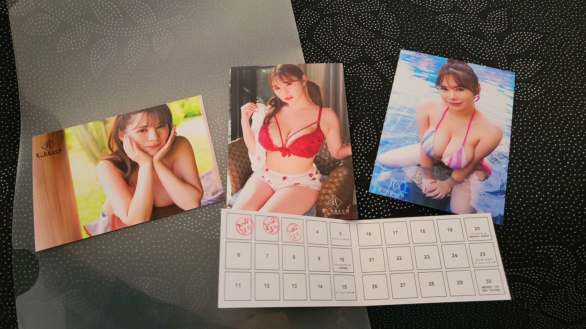 The point card is for every confirmed REbecca DVD/Blu-ray purchase I get a stamp in the card and every 5 purchases I get a bonus at the event, a 1 shot Polaroid, a signed Polaroid, 3 shot Polaroid, a signed Polaroid with the talent wearing the outfit from the event, message & autographed Polaroid, and lastly a 5 second bonus for photos which is a permanent bonus.