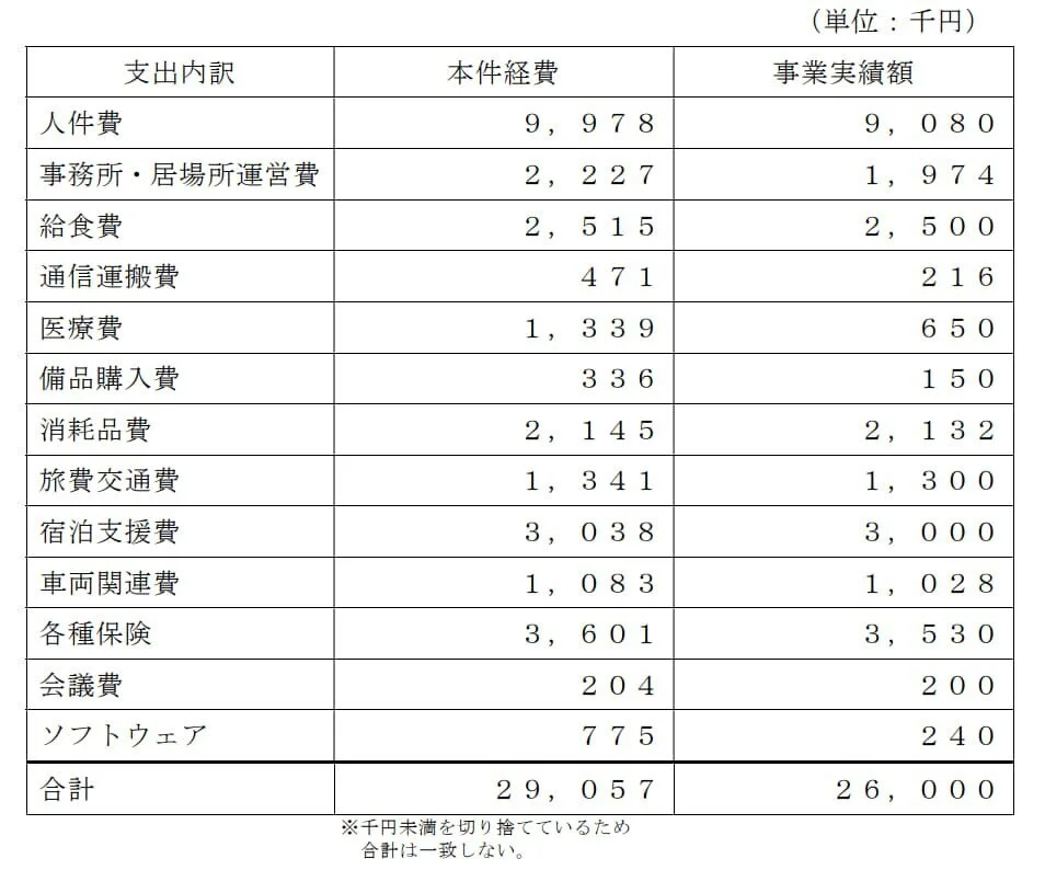 As you can see from the table, the actual deficit comes around at 3,057 thousand yen i.e. 26,000 - 29,057. Since the report to the Tokyo Metropolitan Government is in the form of a statement of account, i.e., the use of the budget paid in advance, the figures on the statement of account were not equal to the actual results.