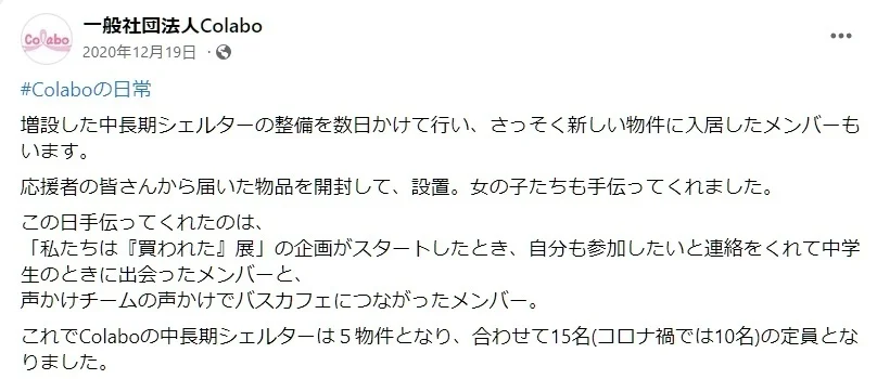 However, what most don’t know that this exhibition was not organized by Colabo, but by it's subsidiary NPO known as Tsubomi that supports a group of girls. The support expenses were 14.61 million yen in FY2020 to 25.78 million yen in FY2021. School lunch expenses are also included. Colabo is a subcontractor for the Tokyo Metropolitan Government's project to support female victims. This is clearly stated in the activity report.