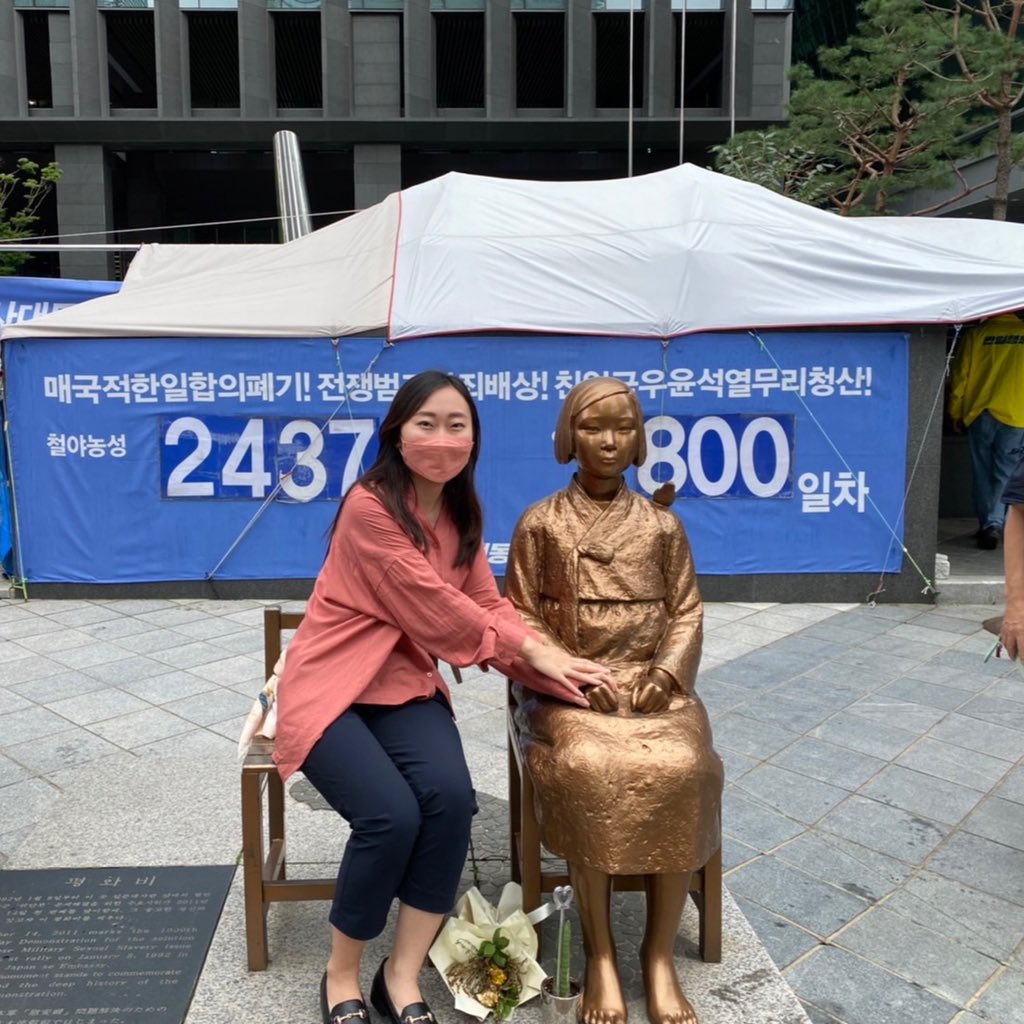 Colabo boss Yumeno posing with the Comfort Women Statue that it sponsored in August 2022