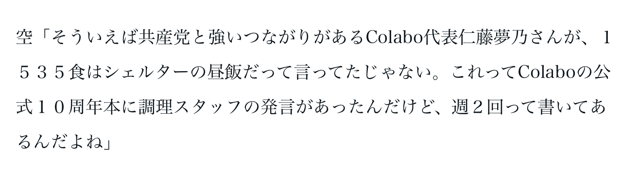 A rough look at the accounting will tell you that food expenses are the ones that have been manipulated the most and it’s hard coming to terms with the meals served, Let us refer to the above quote from Himasora where he cites that "Yumeno Nito, the president of Colabo, said that 1,535 meals were lunch for the shelter”. The thing to note here, is that this is something that even the NPO’s cooking staff mentioned in Colabo's official 10th anniversary book, and it mentions twice a week. Himasora continues, "Twice a week means about 104 times a year. In fact, the frequency of posting lunch photos on Colabo's official Facebook page is less than twice a week, and there are days when no photos are posted”. As per Colabo’s activity report, 10 people stayed at the NPO provided accommodation for a total of 2076 nights, however if they stayed a year long, the math would come around at 3650 nights for a total of 10 occupants. In that case, the average comes around 5.7 girls, if we take into account a full year stay. Now, if one multiplies that by 104 (for the twice-weekly lunch meetings) they’d find it to be approx 592 meals, which is 943 meals short of 1535 meals that Colabo’s boss claims of.