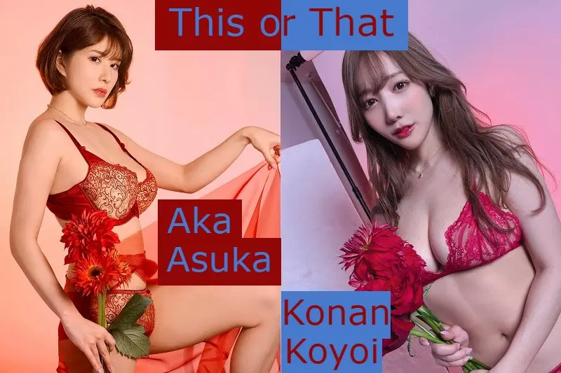 First off Aka Asuka is a little bit older than Konan Koyoi. I think it really shows in their faces as Aka has a bit more maturity to her. For sure I was initially bigger on Aka's face, finding her more attractive than Konan. That being said, the more I've watched both of them the more they've started to even out. I find Aka is still pretty but not nearly as much as I first thought. Similarly, I think Konan has come off prettier the more I watch her. I find it really interesting because Aka has the kind of maturity I prefer but I think the more spunky attitude Konan has in her works and social media actually make her more attractive. Personally I'd say they're about equal right now.