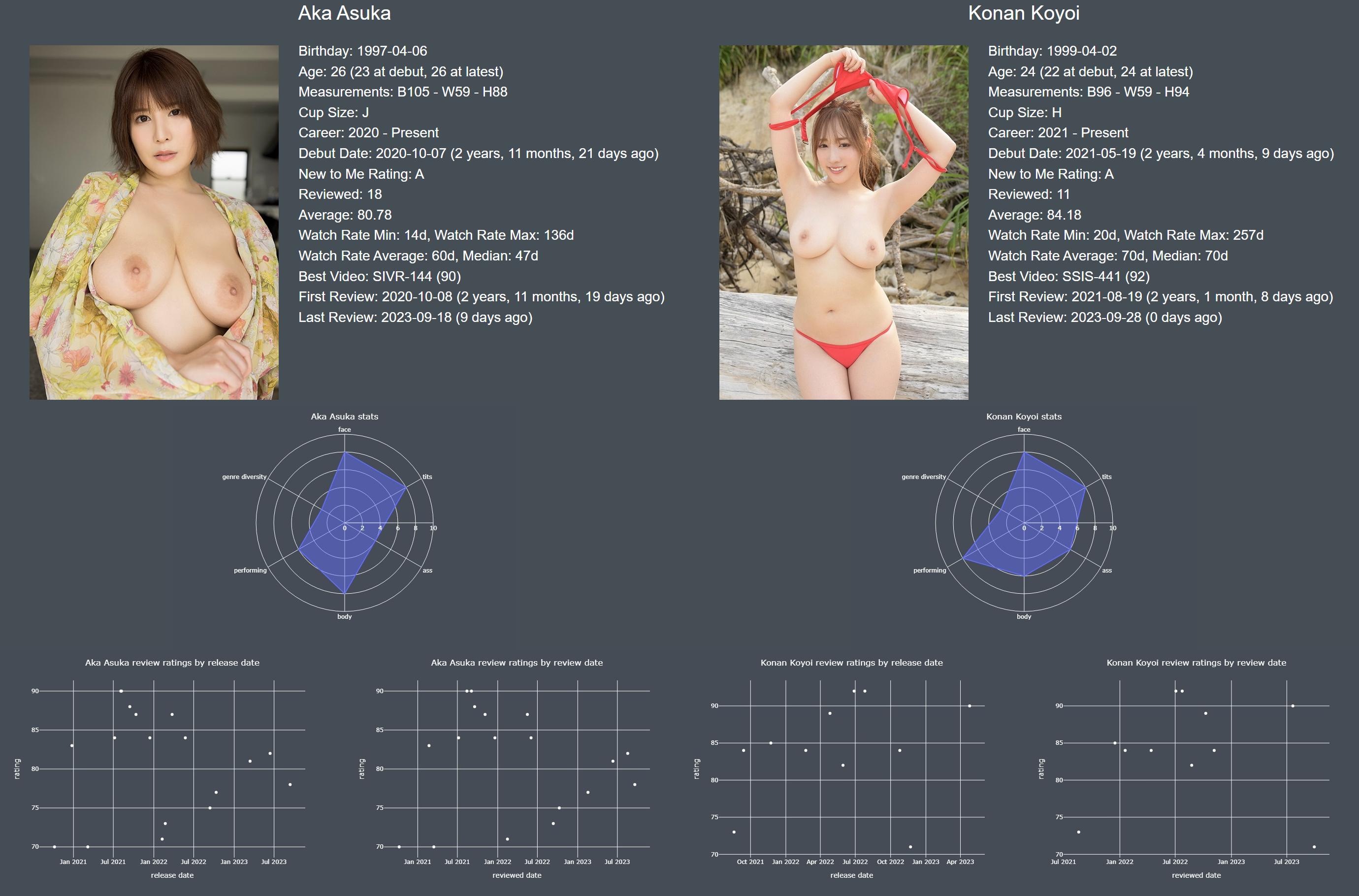 Aka Asuka (Hikaru Nagu, I still can't bring myself to call her by her new name, which is her third name now) and Konan Koyoi have been my favourite debuts from S1 in 2020 and 2021 respectively. I think they make for great actresses to compare for that reason, especially since I have easy ways to compare across debut dates. Even if Aka has been around for half a year longer that's really not that much different, and there's some key points that they're similar on: same studio, same original new to me rating, similar watch habits, and similarly busty.