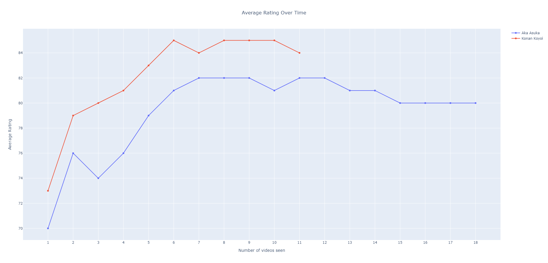 Looking at their average rating over time is also a very telling stat for the two. Where the previous chart had some competition at various points you can see that Konan has always out performed Aka. It might not necessarily seem like a lot but four points is actually quite a lot. Average rating is kind of indicative of them as a whole and part of it can reflect the opportunities they get. Considering they're both at S1 that part of the metric remains constant which means the comparison is actually closer to their performing skills than anything. There are certainly a few differences in the opportunities but a lot of their content is generic big tits stuff and I consider the more spunky opportunities Konan gets to be comparable to the more mature themes Aka gets (such as teacher or office lady). This one also highlights that despite Konan being a better performer and despite that I enjoy Konan videos more, that Aka has other qualities making up for the difference.