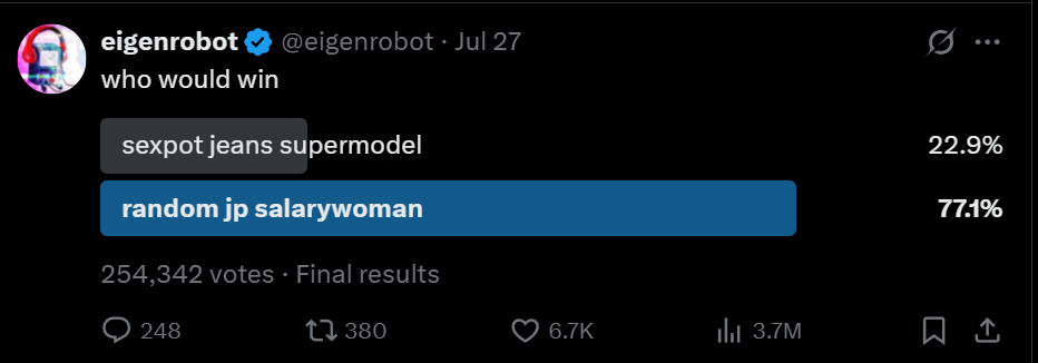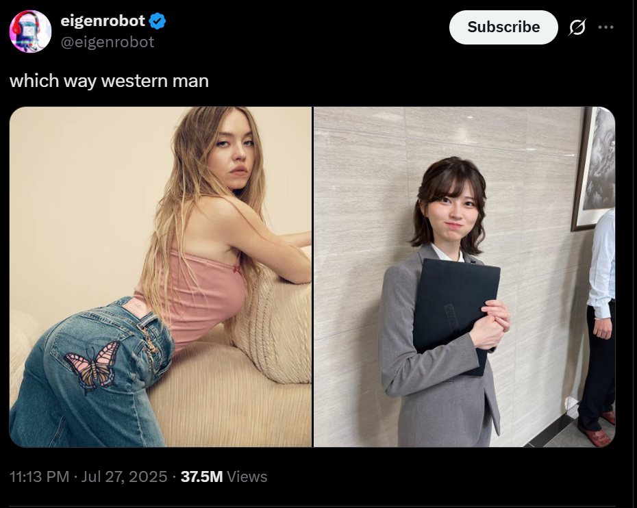 In a ‘Spark, meet Gasoline’ moment of virality, the humorous comparison between the impressively hot Sydney in tight jeans vs a simply cute SAO in a mundane business suit generated a ton of engagement that went on to have a life of its own. Even removed from context, people are wondering why SAO’s photo is everywhere right now. From SAO’s Japan viral of a million or so engagements (an impressive feat in itself) to ultravirality with 80 Million (and counting) engagements and spinoffs. Some interpret this phenomenon as the funny irony where Sydney Sweeney, representing the conservative ideal of the blue eyed blonde with big boobs and fierce sensuality, has met her match with a innocuous and mundane but obviously cute Japanese Office Lady in SAO’s photo. (Even if it is in a humurous context such as a viral meme)