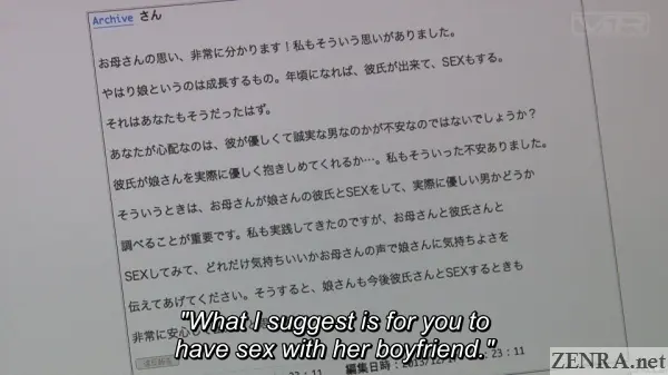 Really, aside from the last two scenes, all the sexual play is not performed in order to 'get off', but in zany attempts to make amends to Nana-chan's (NANA USAMI) sour upbringing. The gist of THE GOOD ANSWER lies in the pseudo (at least we think) Japanese website somewhat akin to Yahoo! Answers or /r/relationships on Reddit. There, you can ask pretty much anything you want and you'll get replies that may or may not be helpful.