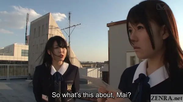 The rooftop, where miscreants meet, where hearts are broken, and romantic relationships are birthed.  The latter--the all-important confessional is what kick-starts YUI KAGAGOE's and MAI ARAKI's advancement into same-sex romance.  While WHERE AN INNOCENT LOVE LETTER TAKES US is technically a 'drama', there's not really any strife.  It's more of a cloyingly sweet yuri love story in JAV form and you know what?  That's a good thing.