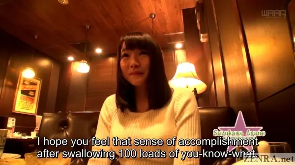 Now with the AYANE SUZUKAWA's charming vocal idiosyrancies out of the way, let's talk about this magnum opus of a title, AYANE SUZUKAWA SWALLOWS 100 LOADS.  Originally 'OVER' was going to be included as the last update from this series starring AIRI NATSUME I believe went past 100.  Then there was GOKKUN VENUS with MIKI SUNOHARA that got to around 107.  VENUS, unlke today's update and the AIRI one was directed by KIRIN whereas WAAP's former cum-centric director KURUMI ICHINOSE handled this one.  As we've noted before, KURUMI has left WAAP on amicable terms and he still seems to be staying within his gokkun comfort zones, but now as a freelance director (mainly with SOD).