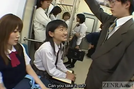 In this edition of Chinpo Teasing Gakuen, we are met by a horde of cute Japanese female students and their dull, 1980's bowl-cut with thick glasses teacher in a subway car. Already talking loquaciously amongst themselves, things began to take on a naughty edge as soon as other commuters leave the train car (be it in disgust with the noise pollution or simply because they have arrived at their destination is a story for another day!) and it isn't long before they start physically their shy and introverted male teacher. As the becomes more and more sexual, they begin to plea in unison to get him to remove his clothes to which he eventually complies to their elated delight and exposes his small cock. Laughing, each girl plays with it by twirling it around in their fingers and are amazed that it actually can get hard—and it does! Due to this sudden and unexpected change of events—a teacher that is aroused by his students has truly baffled these outrageous schoolgirls—they make him remove the rest of his clothes and begin playing with his most private regions in earnest.