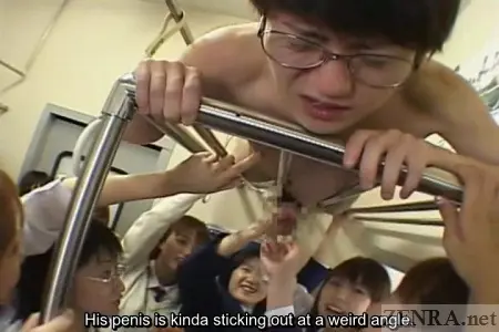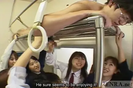 Still naked, they carry him nudist crowd-surfing style to an elevated luggage rack and lay him on it prone so his hard cock sticks through one of the cracks. From this vantage point, each girl takes her time giving this teacher a handjob he'll most likely never forget. When they finally arrive at the next stop, will he still be up there in a state of blissful pleasure and a disbelief? Perhaps, some of the other female Japanese schoolgirls will join him in his embarrassed state of aroused nudity.